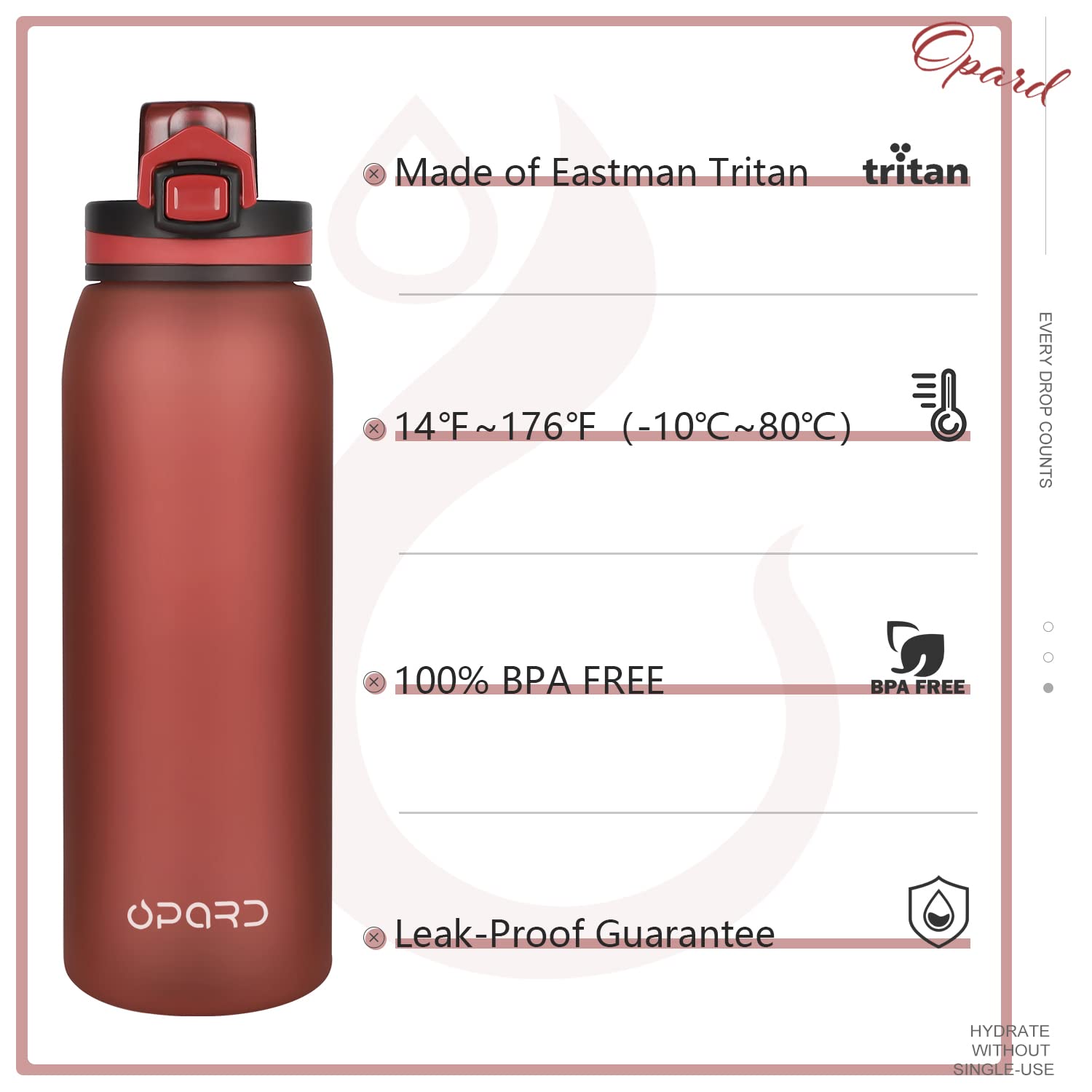 - 【HYDRATE WITH REUSABLE】- Opard has been devoted to reducing the usage of disposable plastic since the first day. We have been helping poor countries build their system of recycling waste plastics for years. Join us, starting with drinking with reusable bottles.