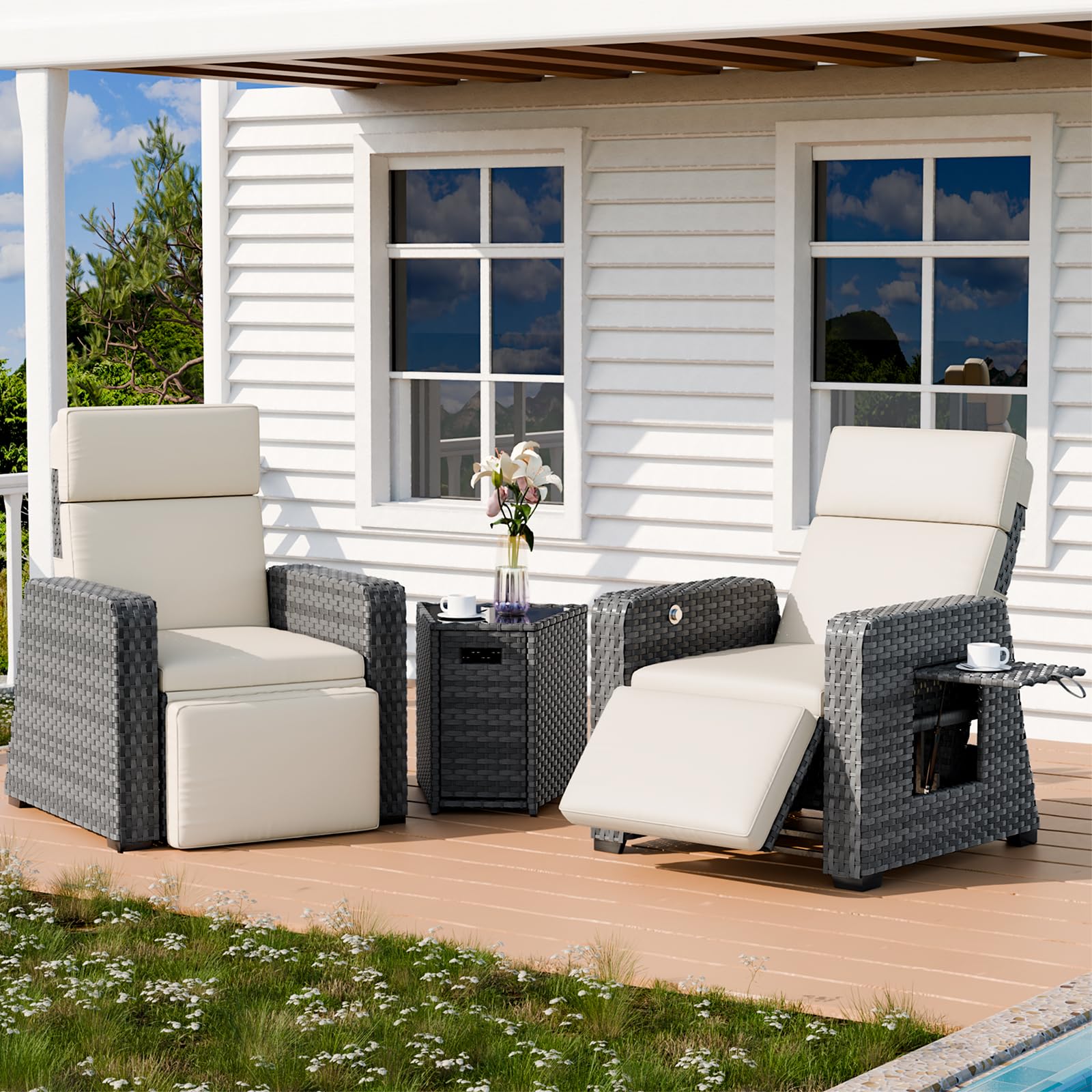 Outdoor Recliners Set of 2, Patio Reclining Chairs Wicker with 150° Lay-Flat Position, Extended Footrest, Flip-Up Side Table, Glass Top Table, Removable Beige Olefin Cushions