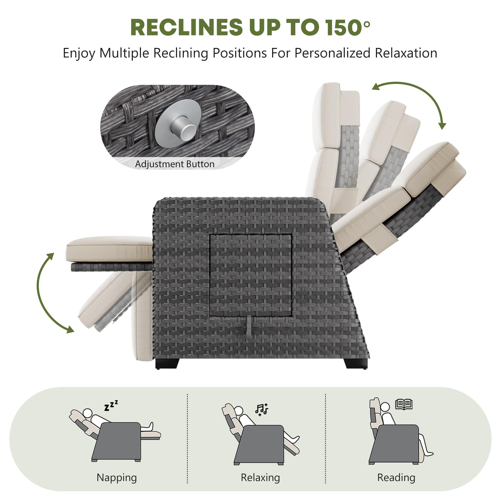 - Effortless Relaxation at Your Fingertips 😌: Effortlessly adjust the reclining angle up to 150 degrees with a simple touch. The ingeniously linked backrest and footrest move in perfect synchronization, providing optimal support as you recline. Enjoy complete relaxation in a fully laid-back position 🌞.