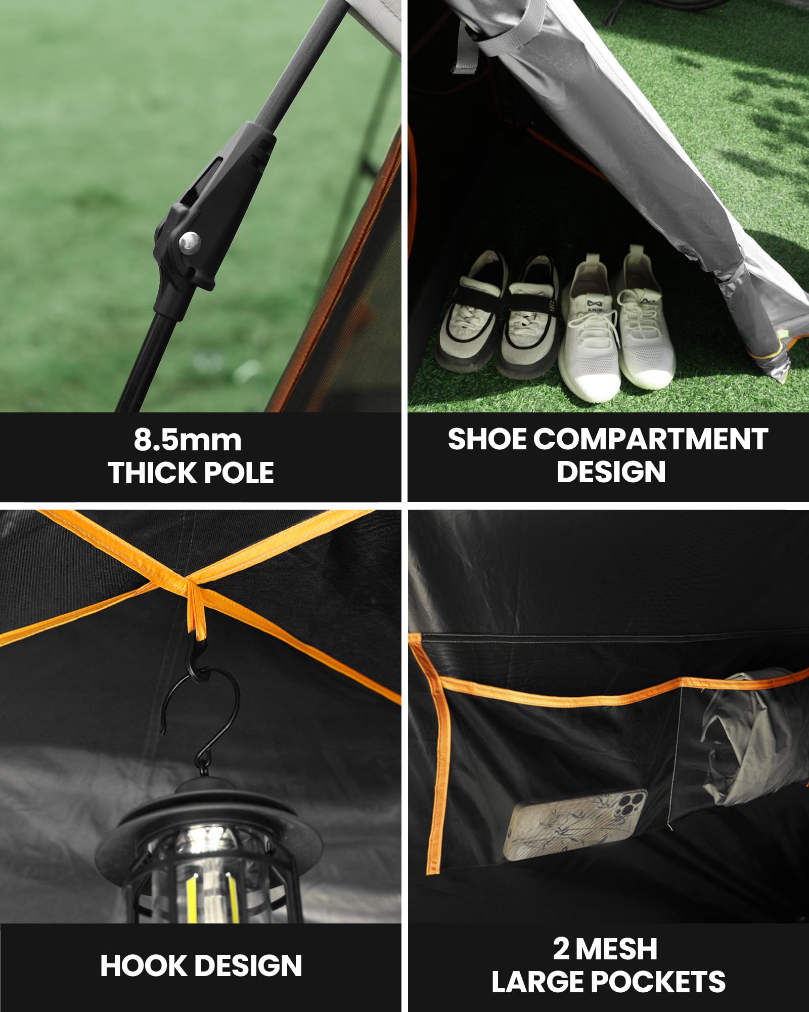 • Quick Pitch & Multiple Interior Storage Options: The camping tent is super easy to put up and take down thanks to pre-attached poles. There is an eyelet at the top of the tent so you can attach a lantern and two side pockets for stowing smaller needed items like a headlamp, cell phone, car keys and so on. The camping tent designed with a shoe storage area to prevent the generation of unpleasant odors inside the tent
