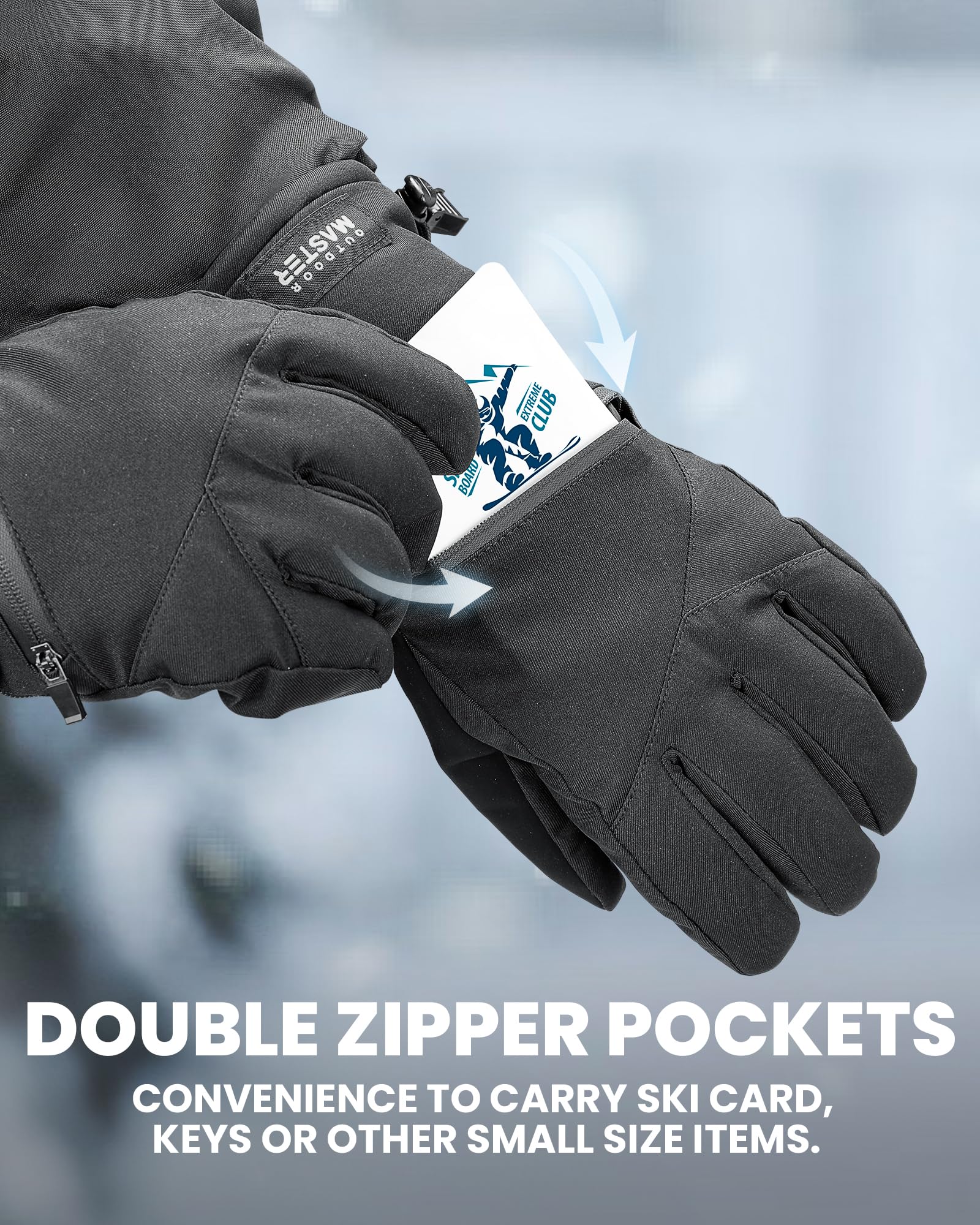 - Double Pockets & anti-lost design: Equipped with double zipper pocket on the back of the hands, the smooth zipper provide the good using feeling when you have the gloves on, perfect for card, small hot pack or keys. The hidden straps made the snow mittens attached to your wrist all the time, never lost your gloves when you take off.