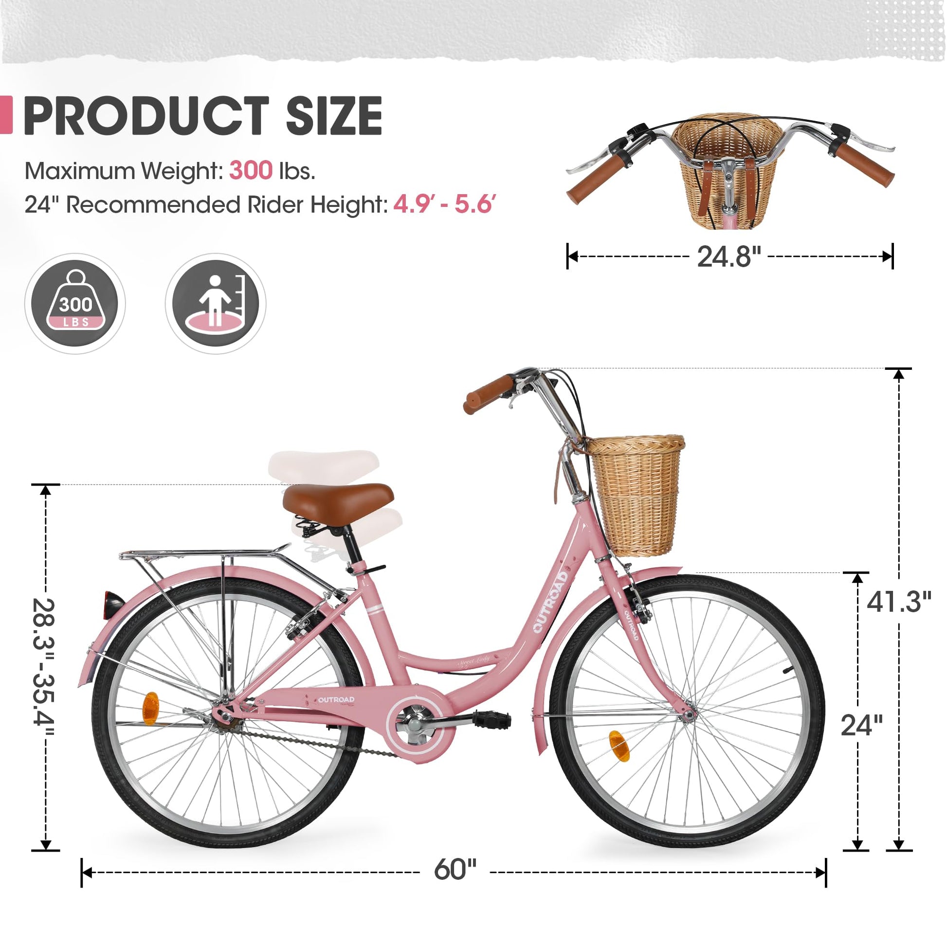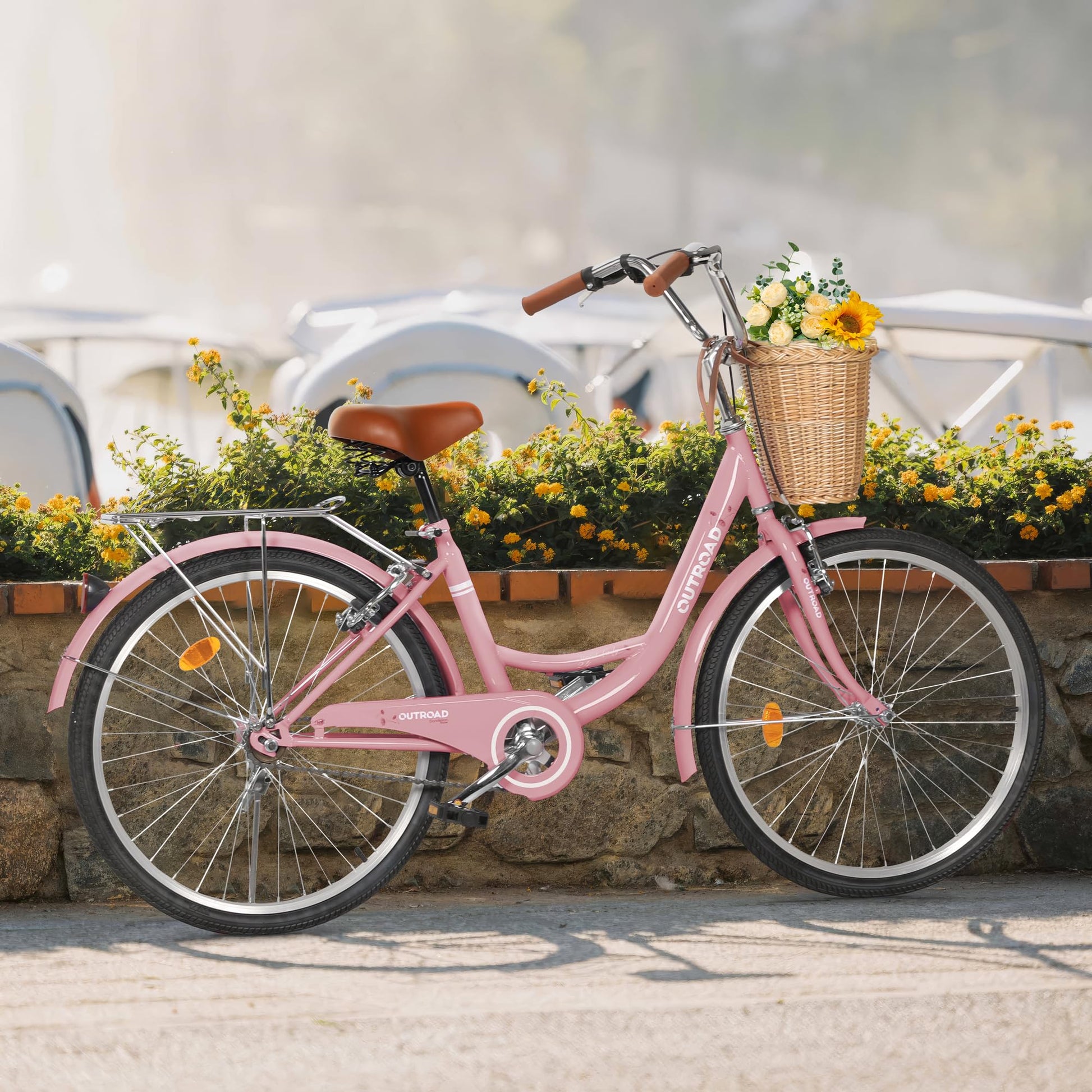 Outroad Beach Cruiser Bike, 24 inch Commuter Bicycle for Adult Men and Women,High-Carbon Steel Comfortable City Bikes with Rear Rack or Basket,Pink