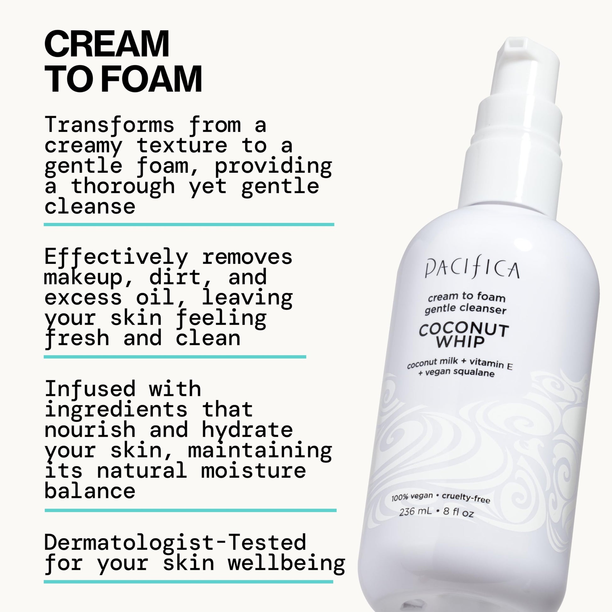 Pacifica Coconut Whip Cream to Foam Face Wash - Gentle Hydrating Facial Cleanser for Dry & Sensitive Skin, Moisturizing Daily Face Wash, Non-Comedogenic Vegan & Cruelty-Free, Dermatologist Tested 8oz