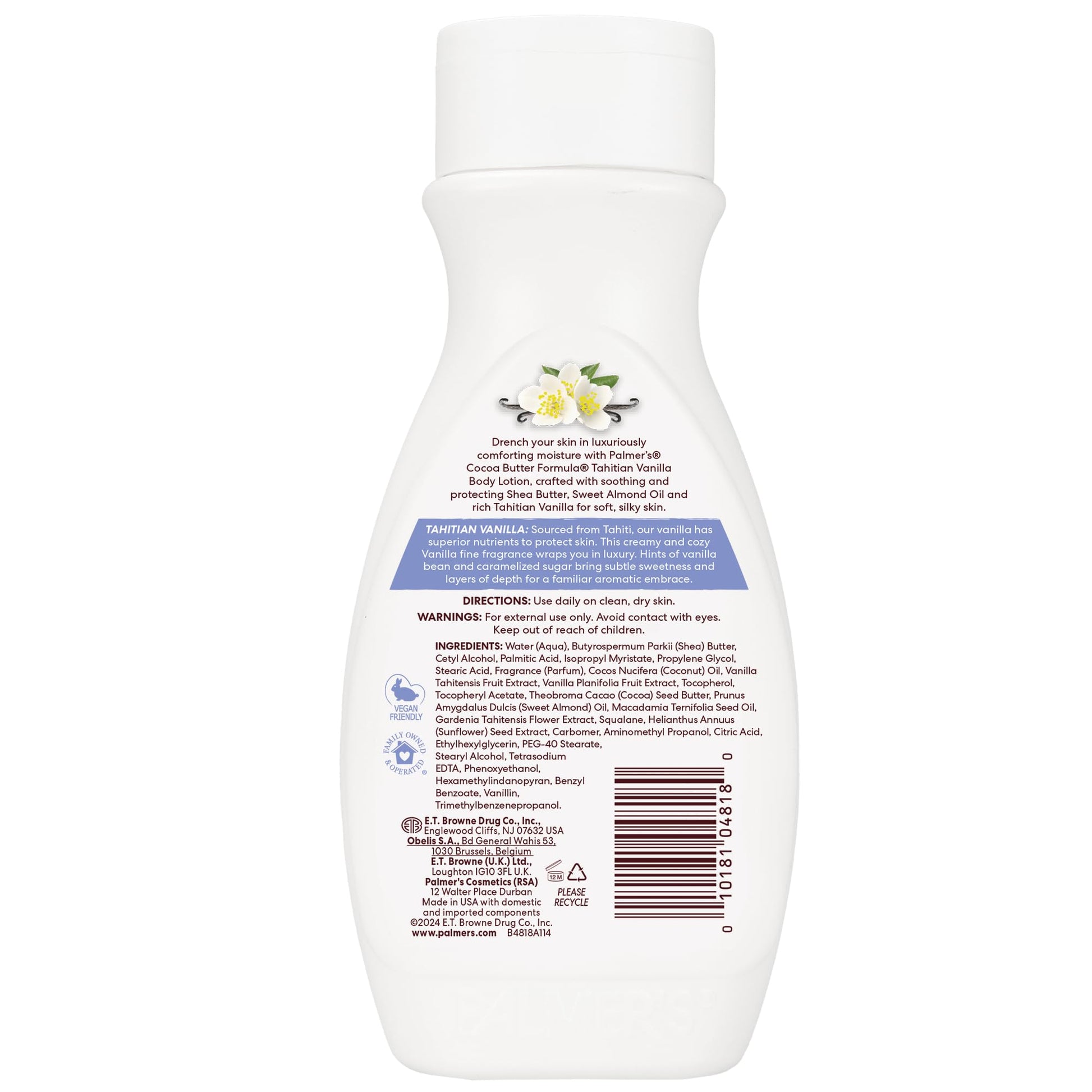 Details: Palmer's Cocoa Butter Formula Tahitian Vanilla Body Lotion, 8.5 Oz, Hydrates and Protects Skin, Helps Provide 48-Hour Deep Moisture Indulge in deep hydration and comforting moisture with Palmer’s Dermatologist approved Cocoa Butter Formula Tahitian Vanilla Body Lotion. Specially crafted with Shea Butter and Sweet Almond Oil, this body lotion helps protect skin, and provides long-lasting moisture for up to 48 hours, leaving skin feeling soft and silky. The warm, inviting scent blends vanilla bean with caramelized sugar, wrapping you in a cozy, nostalgic fragrance that has layers of depth. Perfect for daily use, whether at home, work, or on the go, this body moisturizer is a must-have for your body care routine. Perfect for all skin types. Palmer’s products are made with real, high-quality ingredients, no animal ingredients or testing. This skin lotion is vegan-friendly and free of parabens, phthalates, mineral oil, and dyes. Sustainably sourced Cocoa Butter, Vitamin E, and Tahitian Vanilla work together to nourish, replenish, and soften skin. Palmer's has been a trusted brand for over 180 years, providing high-quality natural products that are passed down from generation to generation. Palmer's Cocoa Butter Formula uses the highest quality natural ingredients for superior moisturization head-to-toe.