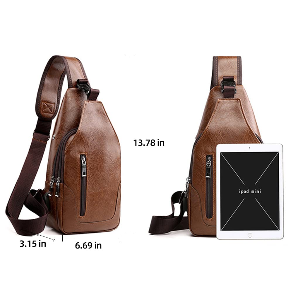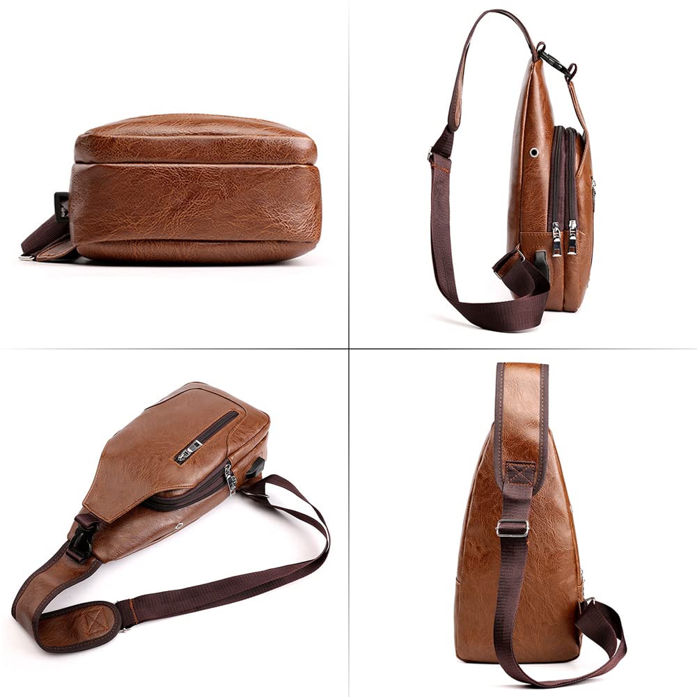 Peicees Leather Sling Bag Mens Crossbody Bag Chest Bag Sling Backpack for Men with USB Charge Port