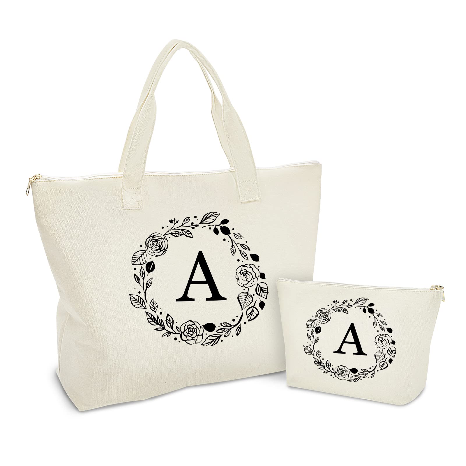 Personalized Initial Canvas Tote Bag with Zipper, Present Bag with Inner Pocket & Make Up Bag, Great Gifts for Women, Mom, Teachers, Friends, Bridesmaids
