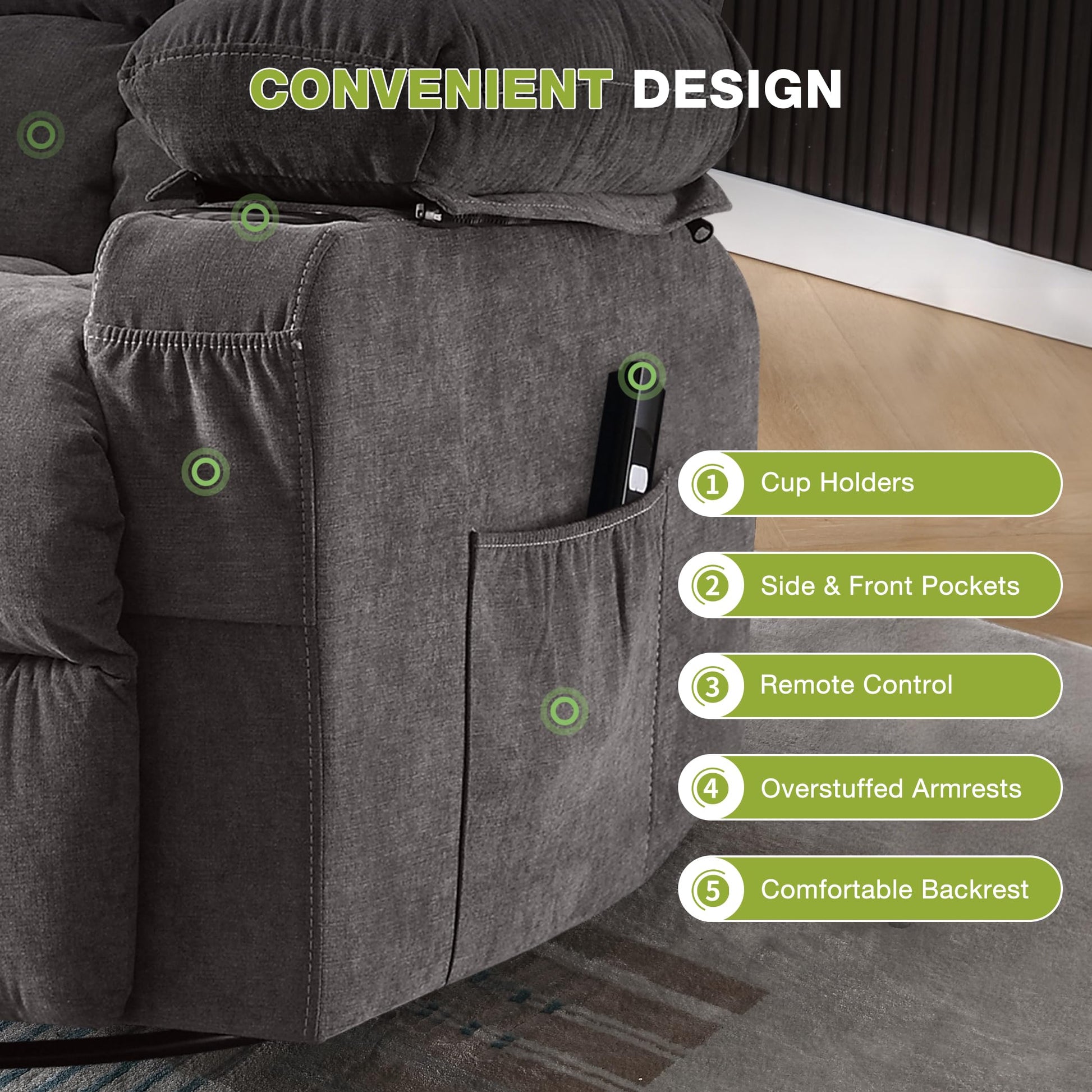 Power Swivel Recliner Chair with Ergonomic for Adults, Oversized Recliner Single Sofa with Rocking Function, Side Pocket, Two Cup Holders and Remote Control for Living Room