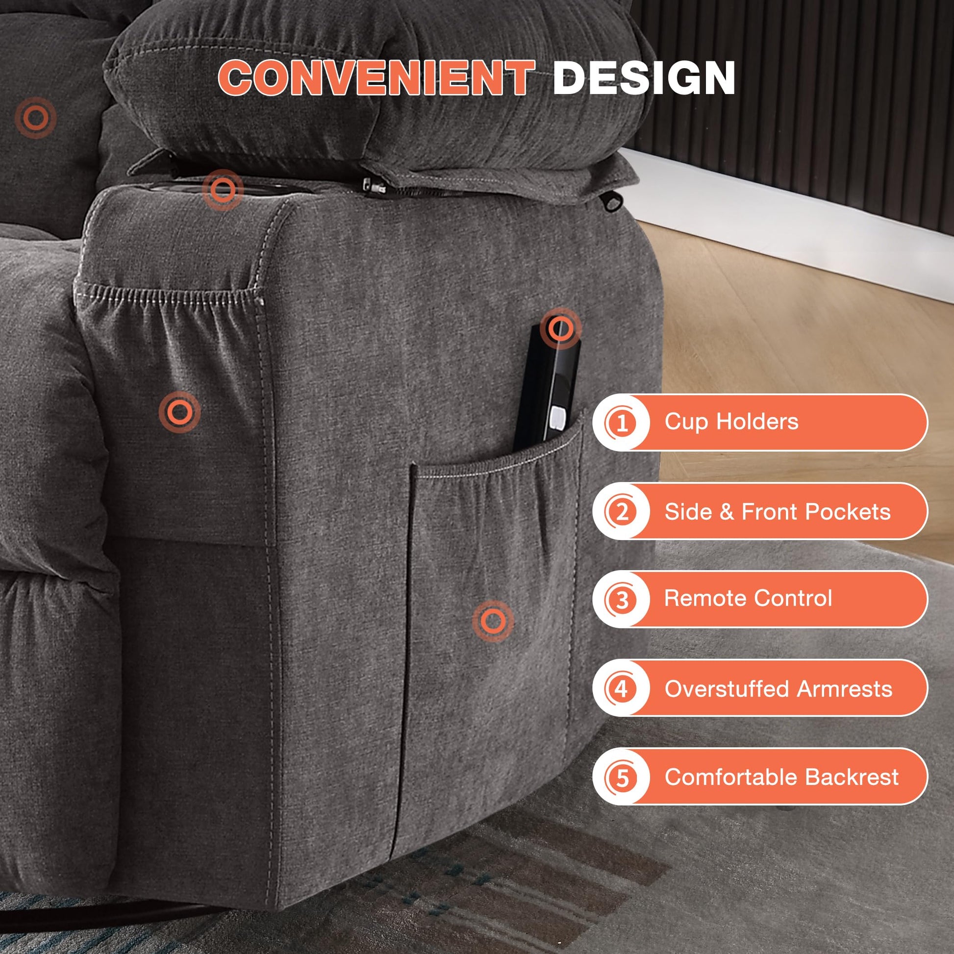 - ๐ฆ๐บ๐ฎ๐ฟ๐ ๐๐ฒ๐ฎ๐๐๐ฟ๐ฒ๐ & ๐๐ผ๐ป๐๐ฒ๐ป๐ถ๐ฒ๐ป๐ ๐๐ฒ๐๐ถ๐ด๐ป: The recliner comes with dual side pockets to hold remotes/books and cup holders to secure drinks. A simple remote control can control the recliner and enhance your seating experience. Every detail is designed with your convenience in mind. These practical features make this electric recliner more than just for daily relaxation.