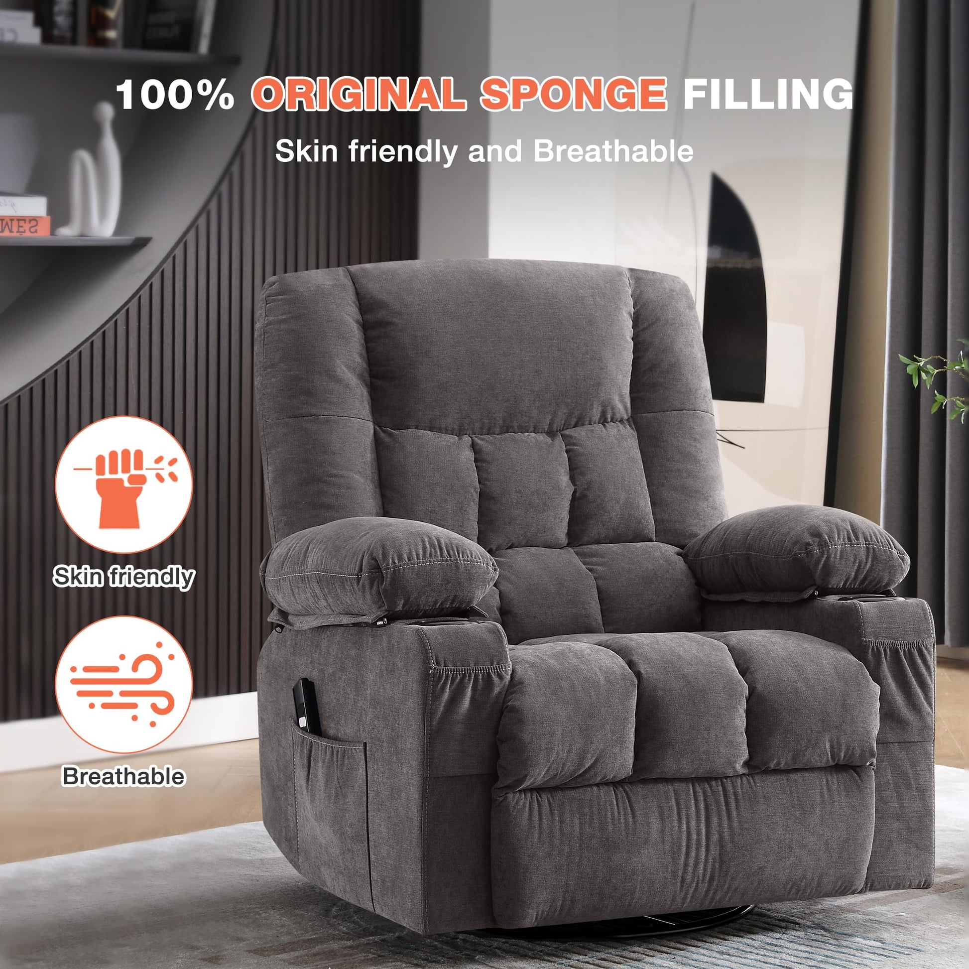 Power Swivel Recliner Chair with Rocking Function for Living Room, Oversized Rocker Recliner Single Sofa with Ergonomic, Side Pocket, Two Cup Holders and USB Charge Port for Adults