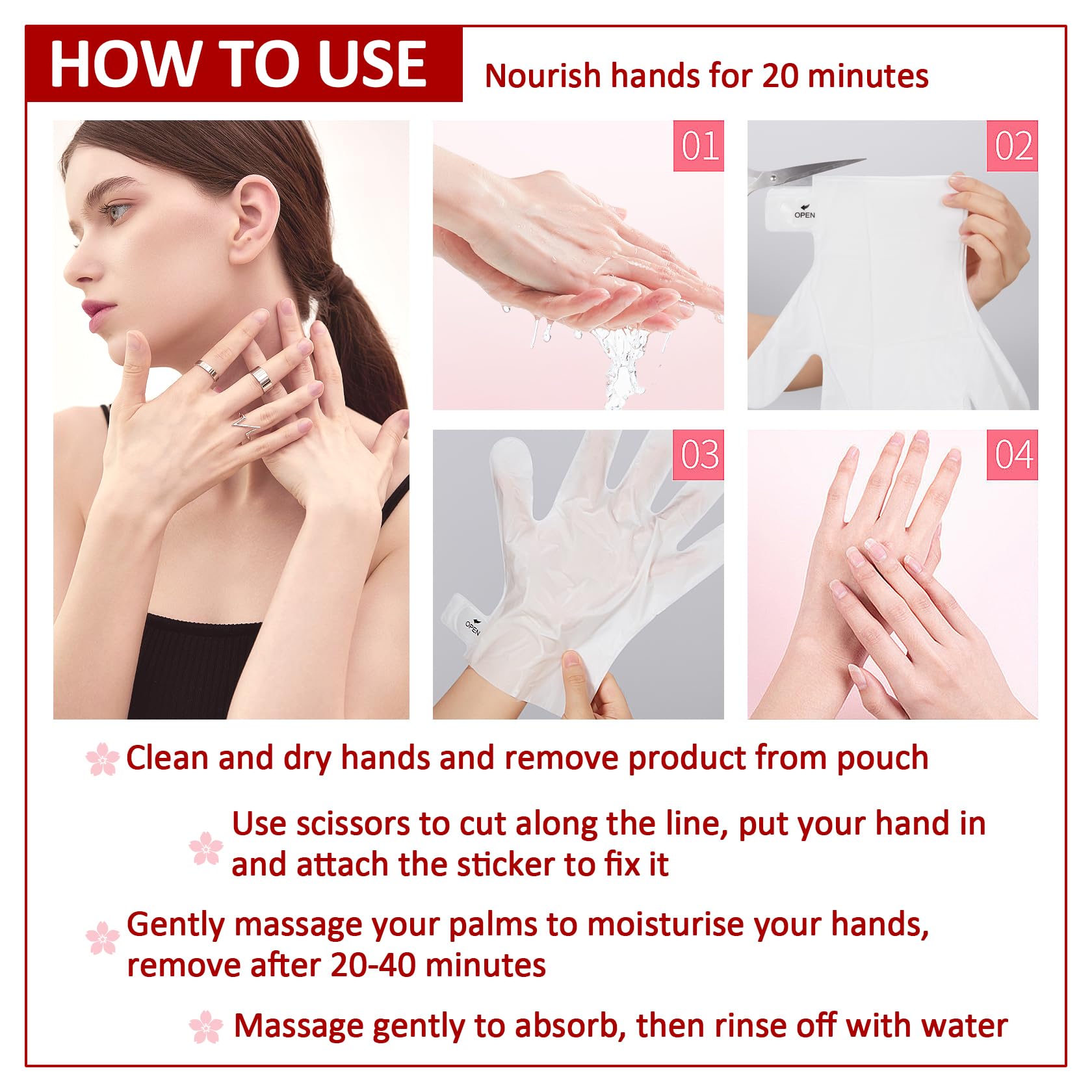 - How to Use: Wash your hands and put on the hand mask, wait for 15-20 minutes, during which you can play with your cell phone, read a book, do housework, etc., and then remove the hand mask after use