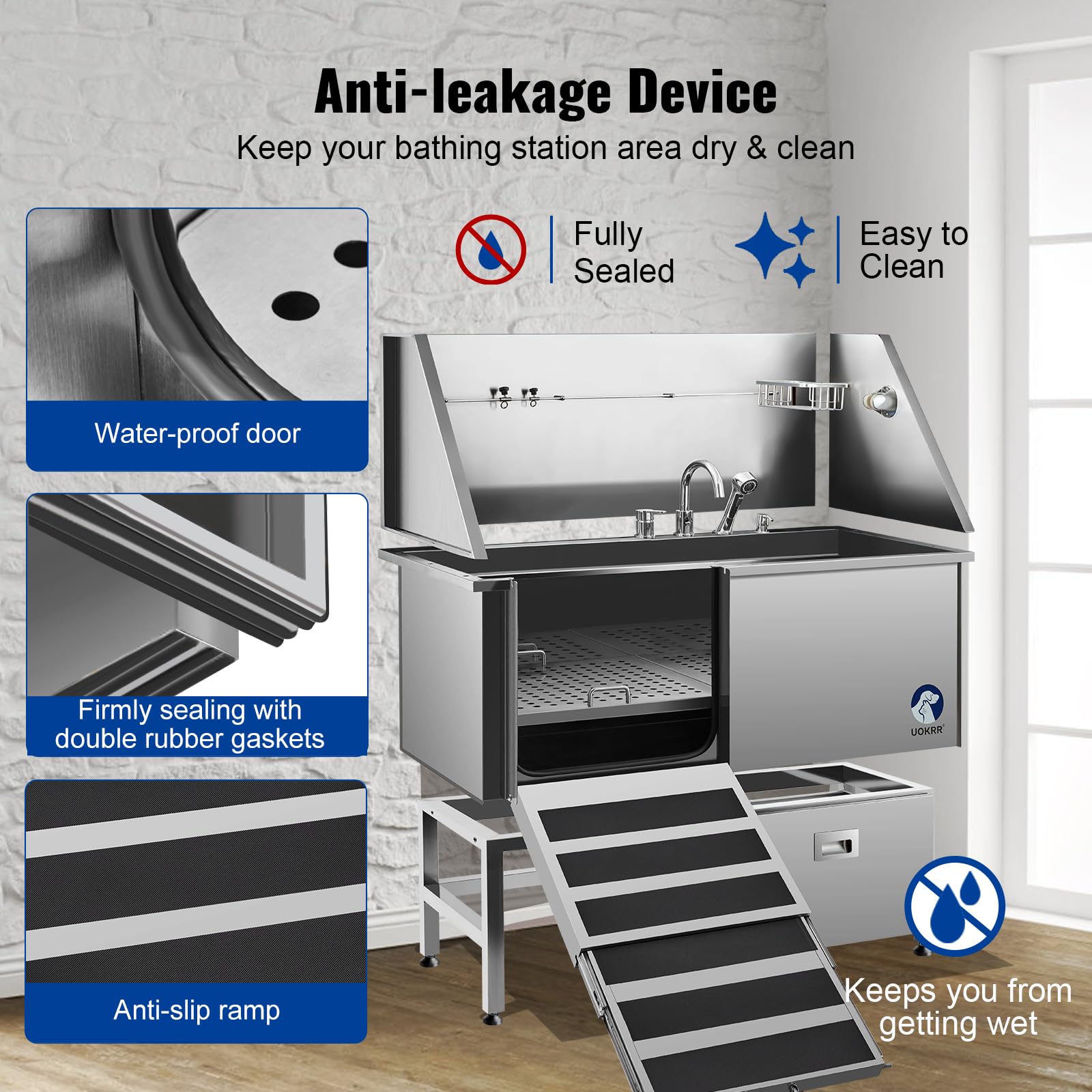 - 【Integrated No-slip Ramp & Watertight Door】Through the built-in door ramp can easily access the tub for your dog. With anti slip pads on the surface for prevent dog from slipping. The door is telescopic, it's easy to pull the handle of the door and set the height as your requirement. The door ramp seals firmly when raised and without any leaking, the big drawer slides smoothly and is a nice feature for towels, shampoo, wash gloves, etc. which can hold up 30lbs.