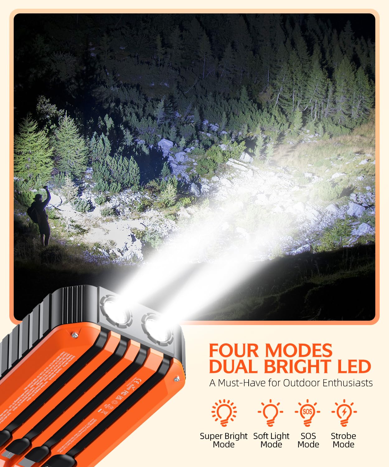- Solar power bank built-in super bright flashlight has 4 light modes (Super Bright / Soft / SOS / Strobe), which can be used as a camping light, emergency light and rescue signal light. In addition, this rechargeable power bank also has a built-in compass, leveling device and solar panel, so it can be hung on your backpack and recharged by the sunlight to get a certain amount of power. Great for outdoor activities such as camping, hiking and other emergencies.