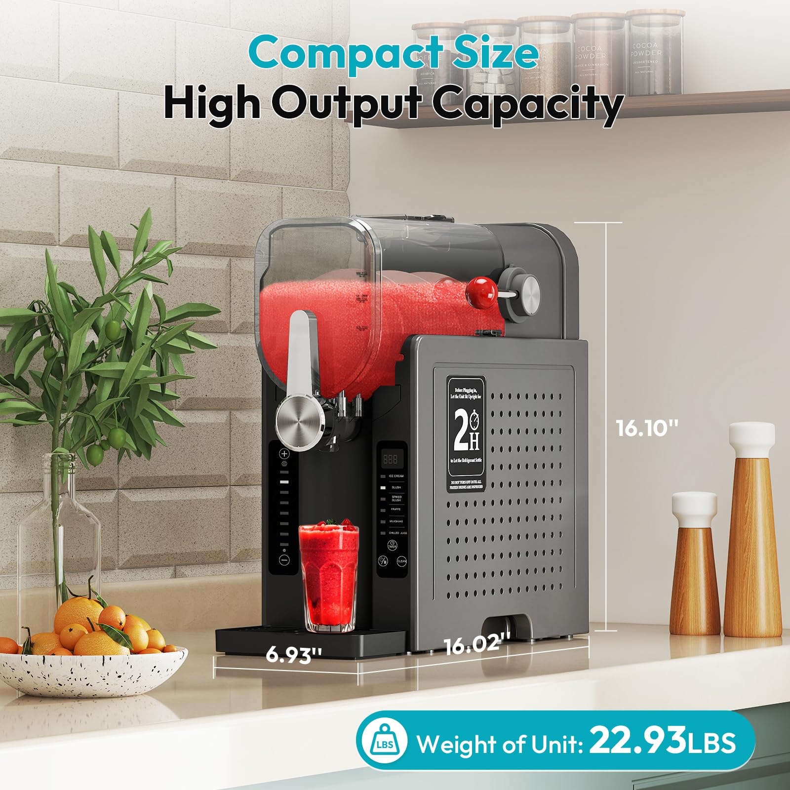 - 【One Touch Frozen Drinks】 The slushy machine with a crystal-clear LED panel and responsive buttons let you select modes, track time, and adjust settings. The digital timer ensures consistency - no more guessing if the slush is “done”. No bulky freezer bowls, no extra gadgets. A true frozen drink machine for perfectionists