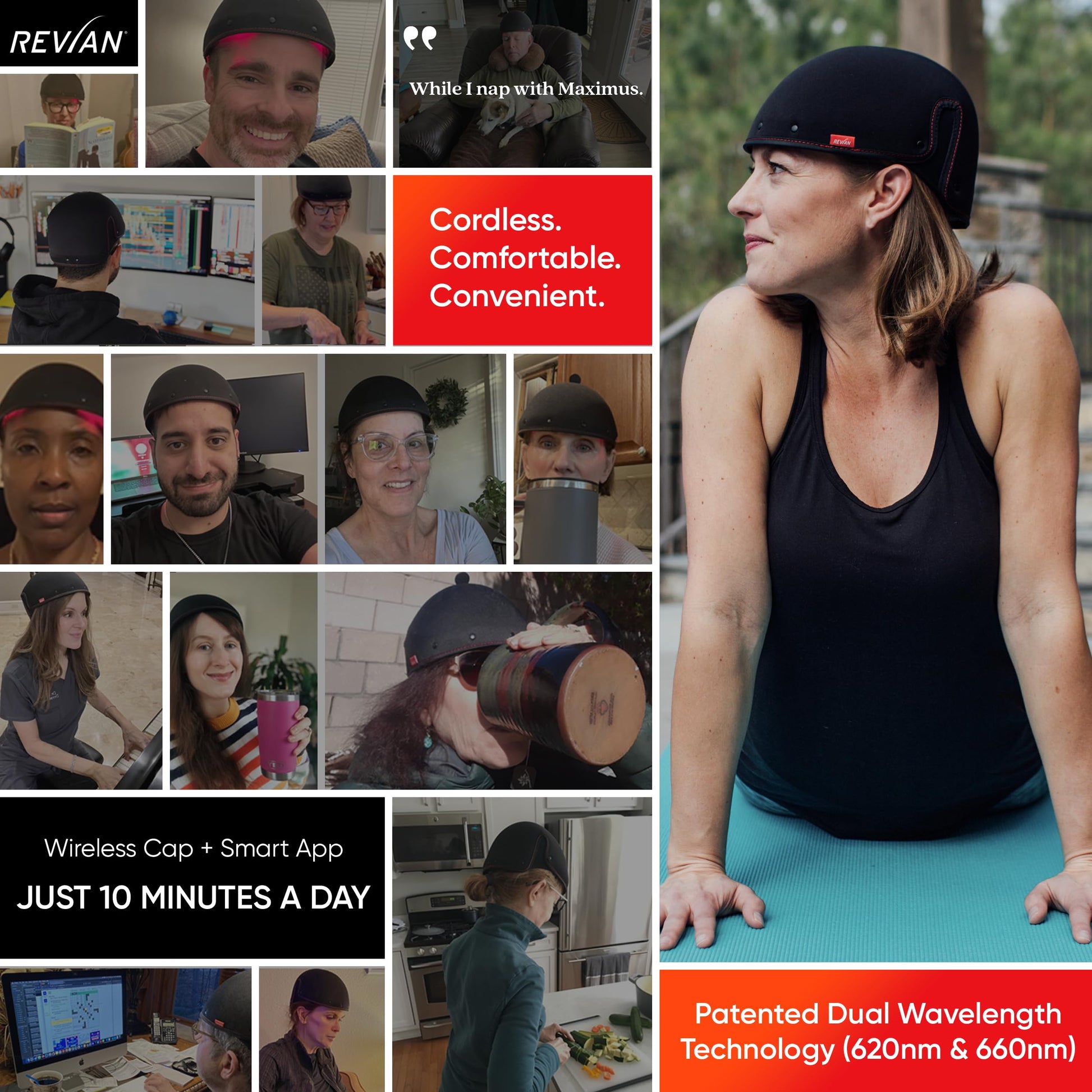 - HANDS FREE DESIGN: Designed for comfort and convenience without interrupting your daily routine. Cordless and lightweight, REVIAN Red’s cutting-edge technology takes a proactive step towards fuller, healthier hair. Our flexible, full-coverage cap effectively targeting hair loss at the crown, hairline, and donor area for hands-free treatment