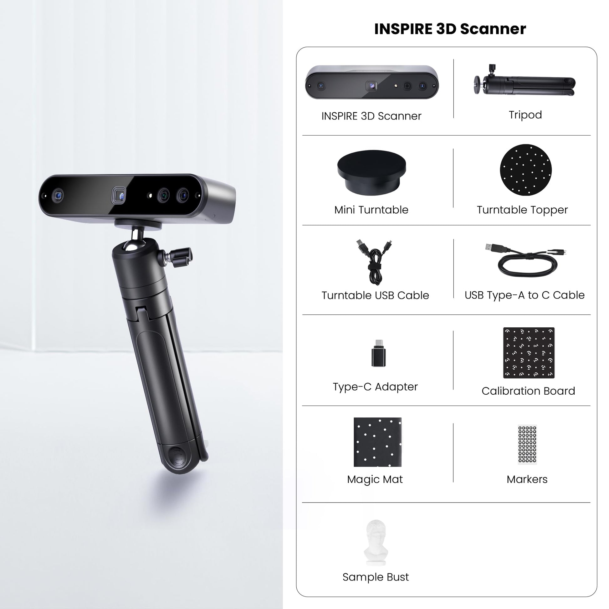 - Wide Compatibility: Connect your INSPIRE to Windows, macOS, Android, and iOS devices—output models in PLY, OBJ, STL, ASC, 3MF, GLTF and FBX formats for compatibility with popular CAD, 3D modeling, and 3D design software such as Fusion 360, Blender, and ZBrush.