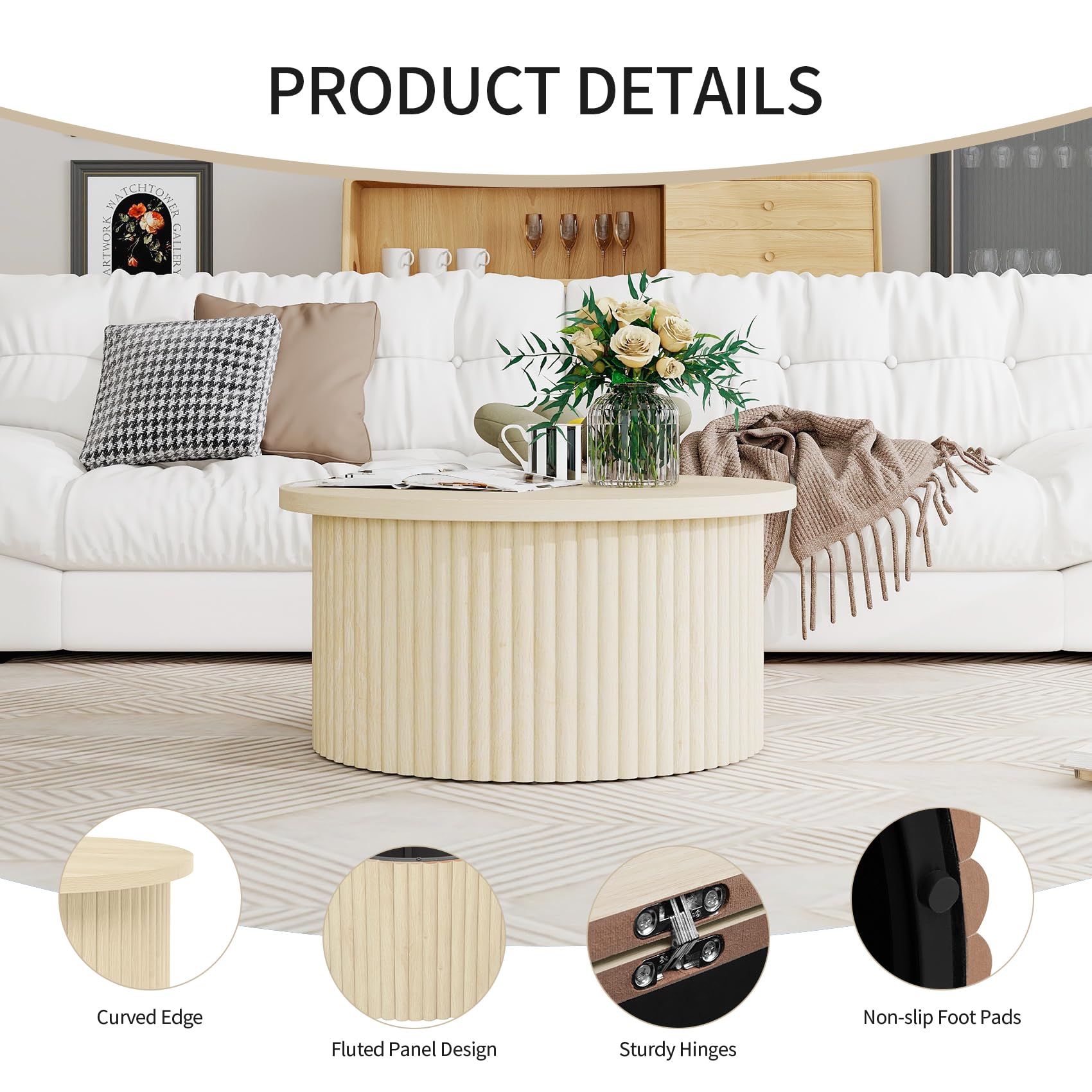 Round Coffee Table with Storage, Wood Modern Fluted Drum Coffee Table with Flip Top, 31.5" Farmhouse Center Table for Living Room, Reception Room, Entertainment Room, Courtyard (1, Oak)