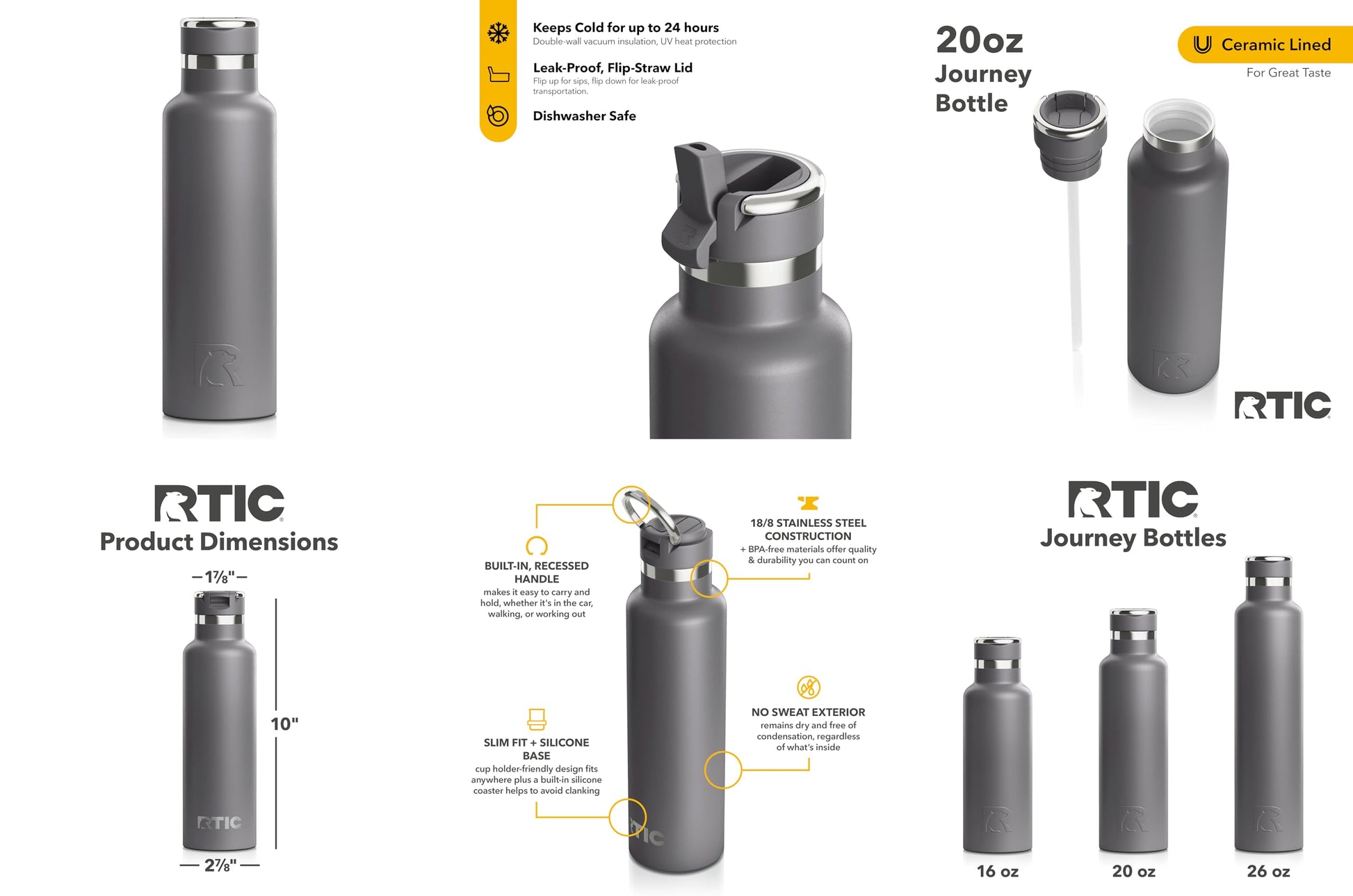 - STAY HYDRATED ON-THE-GO: Featuring a built-in, recessed handle, the RTIC Journey Bottle is easy to grab and carry wherever you go. Attach this stainless steel bottle securely to any bag or backpack with a personal carabiner for hands-free convenience.