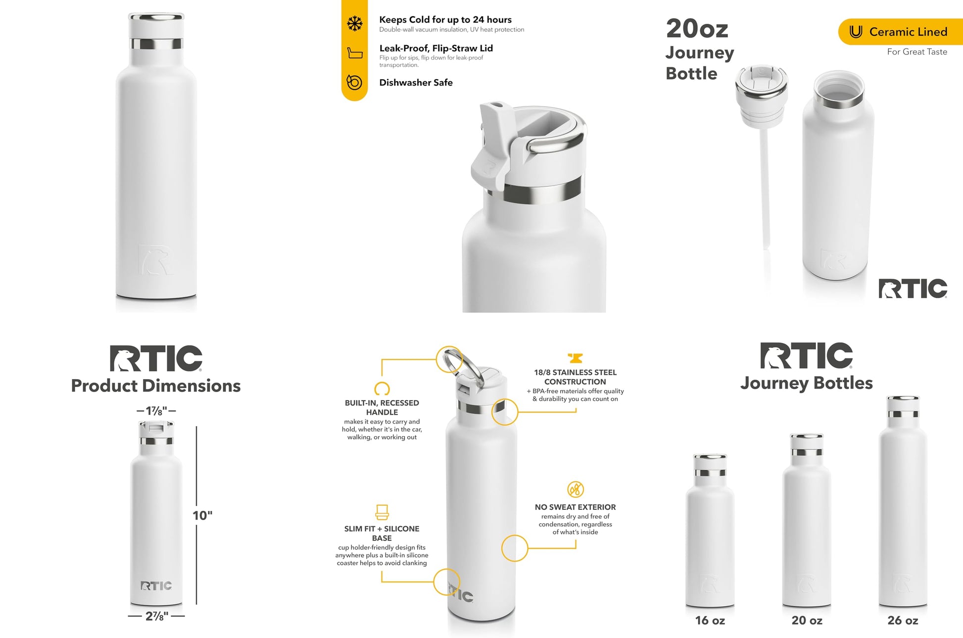 - STAY HYDRATED ON-THE-GO: Featuring a built-in, recessed handle, the RTIC Journey Bottle is easy to grab and carry wherever you go. Attach this stainless steel bottle securely to any bag or backpack with a personal carabiner for hands-free convenience.