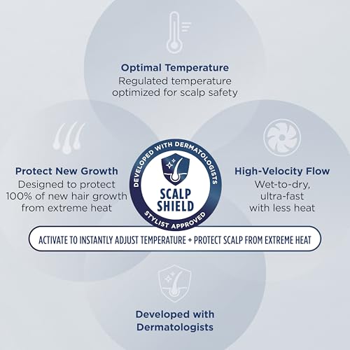 - Scalp Shield: Developed by dermatologists. Approved by stylists. Activate to instantly adjust temperatures and protect your scalp from extreme heat. Designed for ultra-fast wet-to-dry styling with less heat exposure to protect 100% of new hair health.