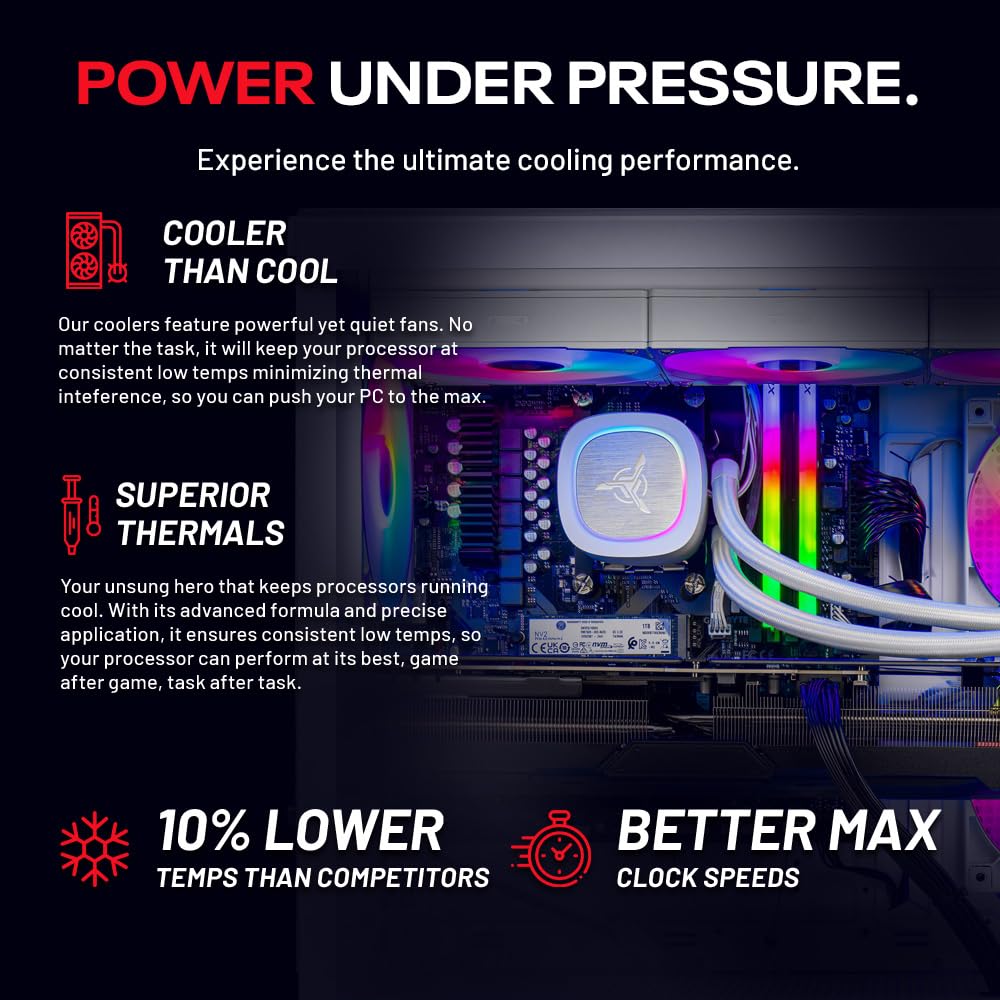- High-spec AIO liquid coolers used, delivering unmatched cooling performance for a perfect operational experience and unparalleled cooling performance. With hardware unrestricted by temperature limits, you can unleash its full potential. Whether gaming, creating, or working, you'll never suffer from thermal throttling again. | Skytech Azure Gaming Case with Tempered Glass, White | 1 Year Warranty on Parts and Labor | Free Technical Support | Assembled in the USA