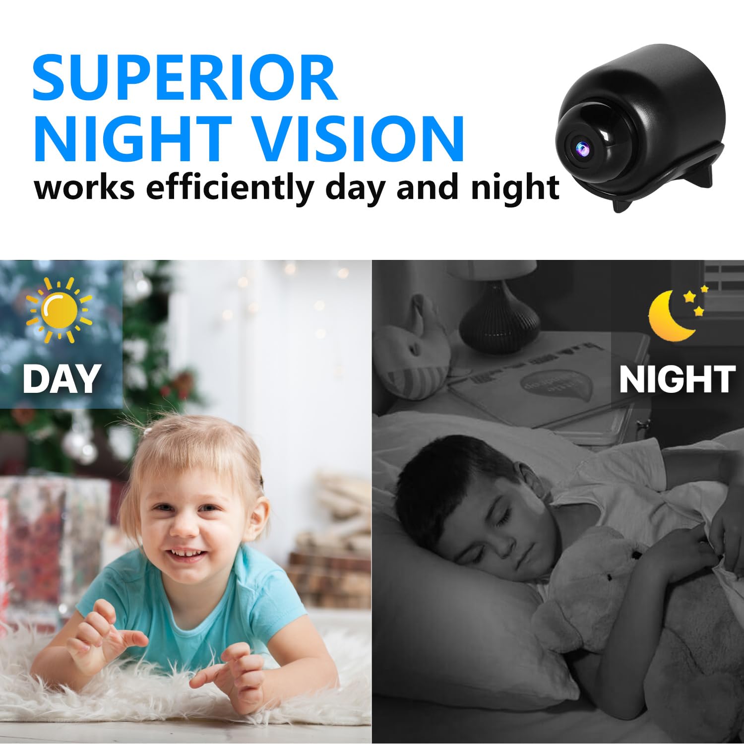 - ✔️【Upgrade night vision】— smallest Cam biggest feature is night vision, using two 940nm infrared lights, night vision distance up to 26ft, so you can see very clearly in a low light environment, or even in total darkness, the infrared light is not glowing. Therefore, suitable for installation indoors, outdoors, companies, parking lots and other places to protect your safety.