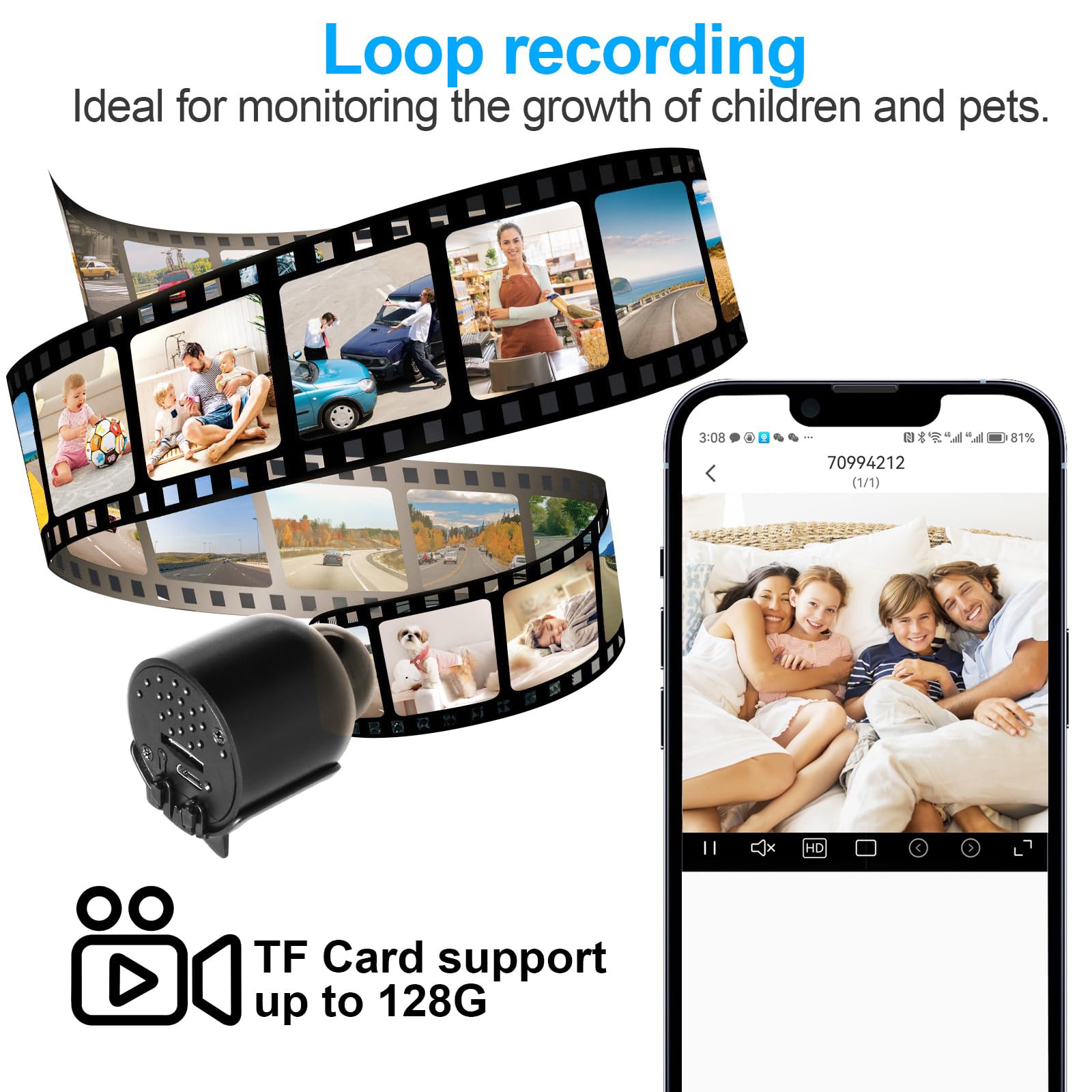 - ✔️【Never Stop Recording】— Smallest Cam camera also supports loop recording without the problem of memory hogging. When the memory card is full, the latest files will overwrite the oldest ones. You will never miss the important things you want to know. You can use it to record the growth of your pets and children.