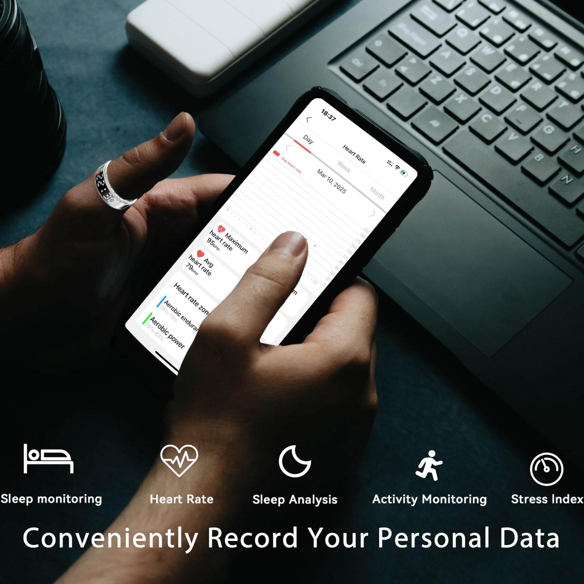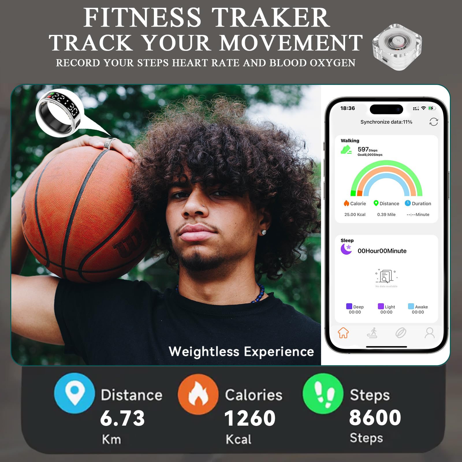 - 【Sleep Tracker】Smart rings also record your sleep data.The inner of this sleep ring is made of epoxy resin, giving you a comfortable wearing experience. When you wear the health ring to sleep, it will automatically monitor your sleep. You can view your daily, weekly and monthly sleep data in the App, and monitor your falling asleep, waking up time, and sleep quality through charts. It helps you adjust your habits and improve your sleep quality