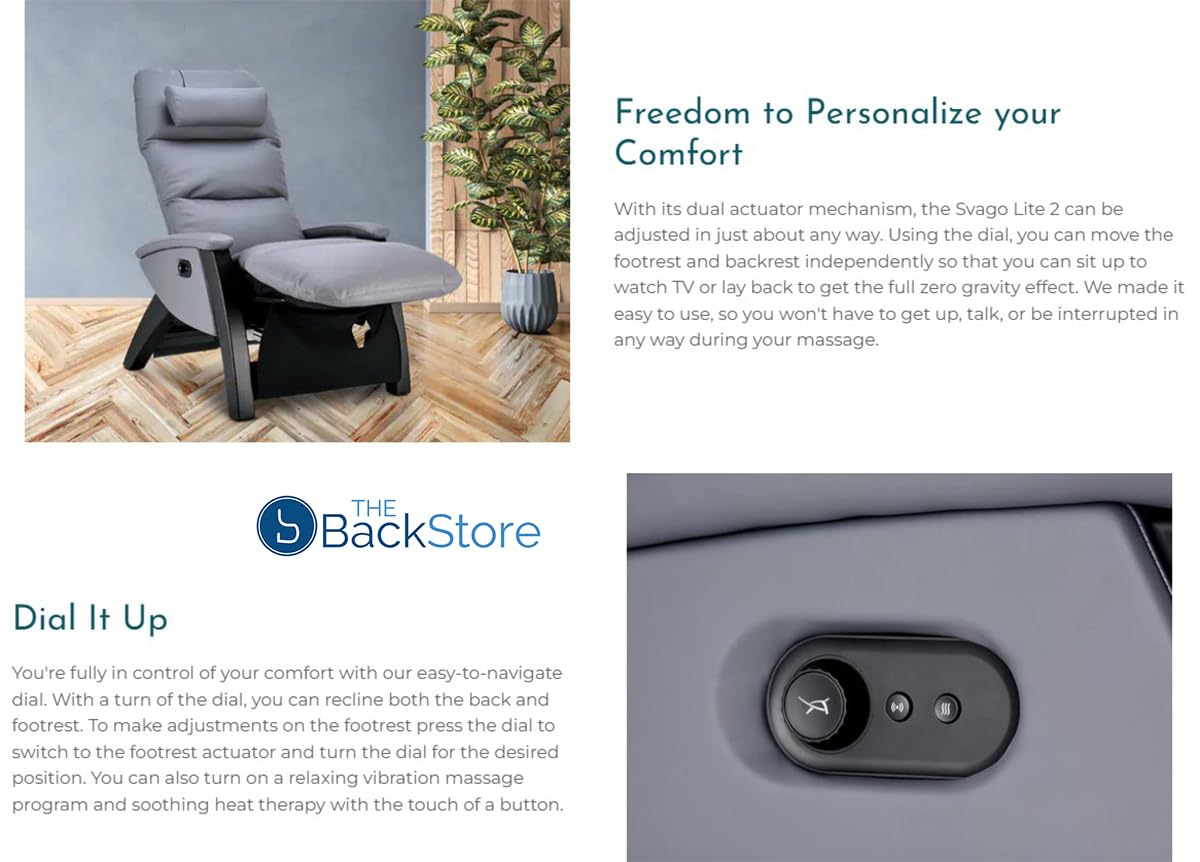 Details: Svago Lite 2 SV210 Dual Power Infinite Position Zero Anti Gravity Recliner Chair with Heat and Air Massage- Svago Lite 2 includes synthetic hyde, hand-carved wood base, lumbar vibration massage and heat, relaxation, self-care, quicker recovery, and back health are here. They are designed to suspend your body into a neutral posture where your feet are elevated in alignment with your heart, creating a weightless feeling. This position helps to reduce pressure on your spine and joints, improve blood circulation, and ease muscle tension. Dial to Bliss - Use the smart dial to recline all the way into zero gravity position or stop in any position by simply letting go. Massage - Full back massage allows the muscles to relax and improve blood circulation. Crafted with Style - Synthetic hyde and hand-carved wood base adds elegance and style to your home. The durability and superb craftsmanship allows you and your family to enjoy the chair for years to come. Heat - Heat helps dilate blood vessels, increasing oxygen flow and nutrients to tissues. Vibration helps to contract and relax muscles, loosening knots and tension. Personalize your Comfort - Dual actuator mechanism so you can move the footrest and backrest independently to watch TV or lay back for full zero gravity effect. Dial It Up - With the turn of the dial so you can recline both the back and footrest. To make adjustments on the footrest press the dial to switch to the footrest actuator and turn the dial for the desired position. Upright Dims: L x W x H - 40.9in x 29in x 46.5in Reclined Dims - 63in x 29in x 29.5in Weight - 85lbs. Capacity: 300lbs Seat Width - 24.8in Wire Length - 9ft Box Dims - 42in x 30in x 26in Svago Warranty - 1 Year In-Home Parts & Labor Service with 2 Years Parts