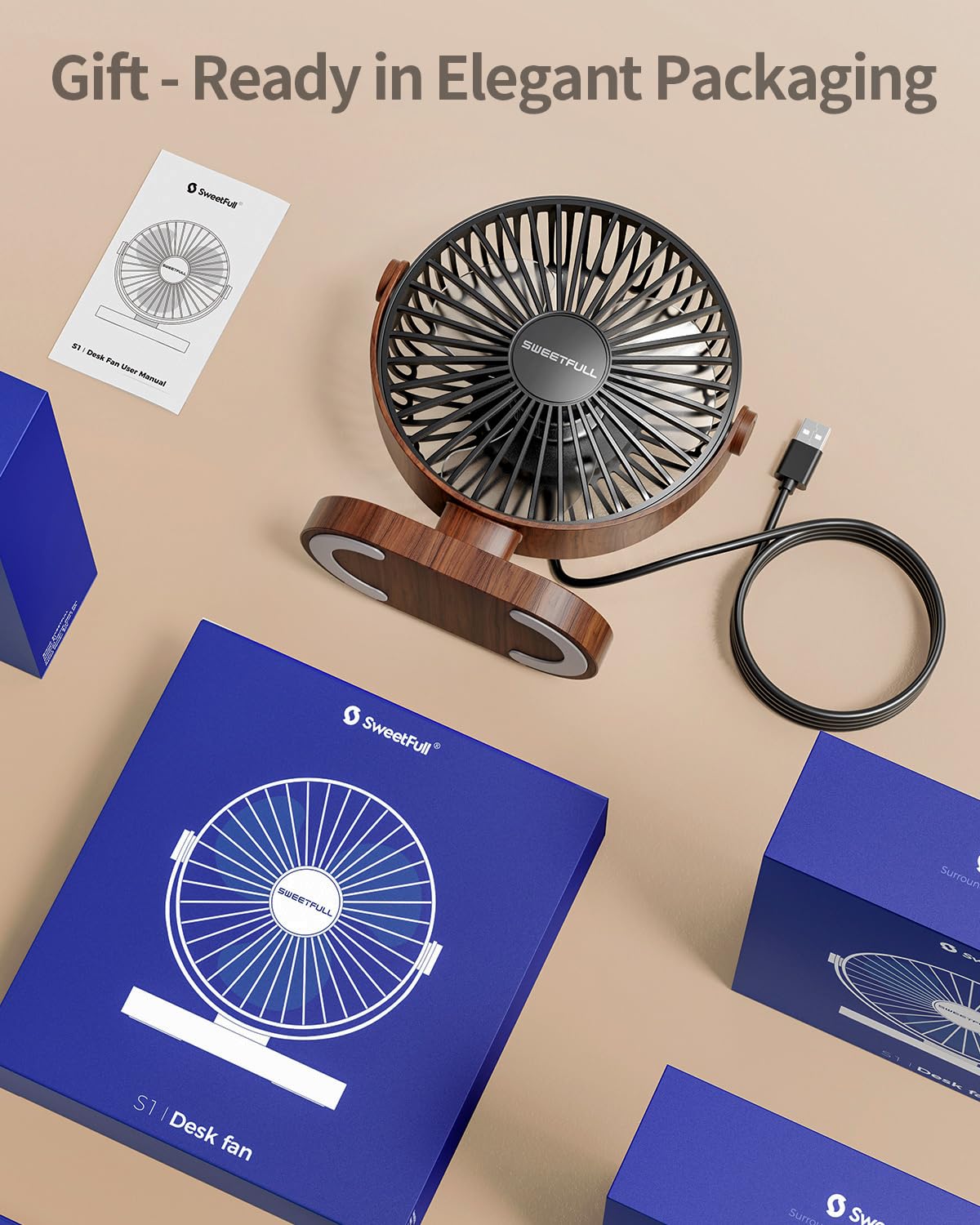 SWEETFULL 6.5 Inch USB Small Desk Fan, 3 Speeds Quiet Portable Desktop Table Fan, 360° Adjustment Personal Mini Fan for Home Office Car Outdoor Travel (Black wood grain)