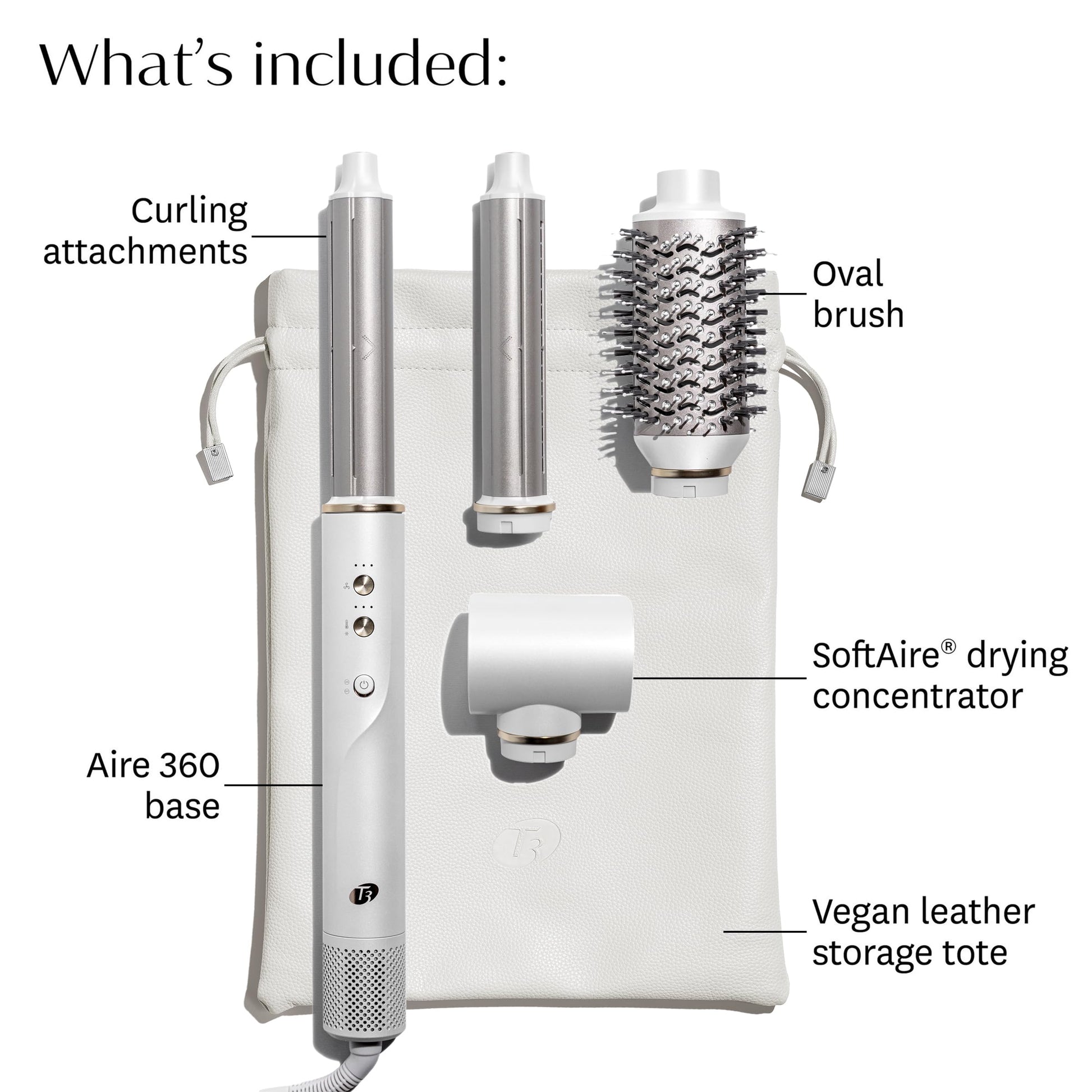 Details: Discover air styling's newest breakthrough. Designed with high-performance heat and ceramic attachments, the Aire 360 air styler blowout kit styles bouncy blowouts and lasting curls with nothing but air. Powered by T3 Aire 360 Technology, superior airflow wraps hair effortlessly to style blowout curls with zero heat damage,* and extra-long ceramic curling attachments harness high-performance heat to deliver long-lasting results. The custom-designed oval brush features SmoothGrip bristles and a ceramic surface for pro-level smoothing and shaping. And the SoftAire® drying concentrator delivers fast-yet-gentle drying that helps protect hair's natural moisture. All attachments pair with the Aire 360 base, engineered with a smart microchip for digital heat control and a high-speed AireX motor for our fastest drying yet. Fast, easy styling that's gentle on hair. Big-time body and shine. Blowout curls that defy gravity. *Based on a third-party study in which a tensile strength test showed no mechanical damage to the hair when using the T3 Aire 360 curling attachments set on the highest temperature and highest velocity on hair in both a dry state and a 20% wet state.