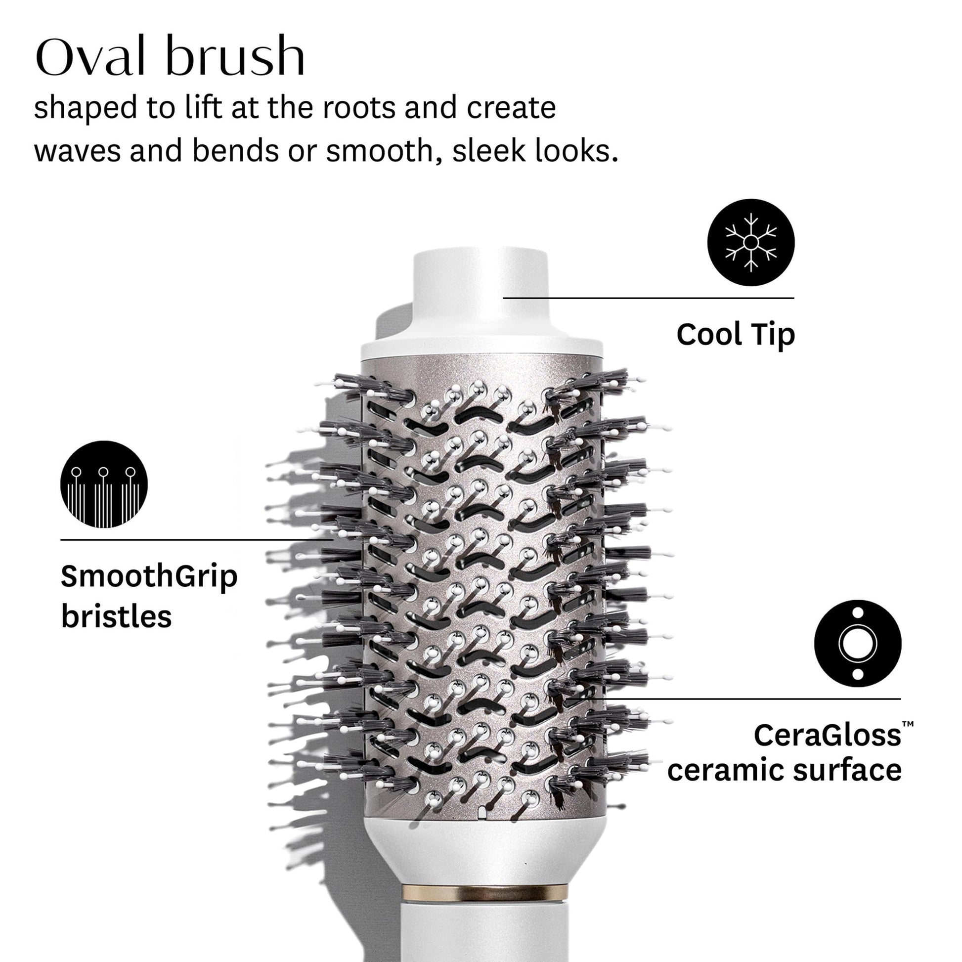 - Oval brush attachment is custom-designed with SmoothGrip bristles and a CeraGloss ceramic surface to lift, smooth, and boost shine
