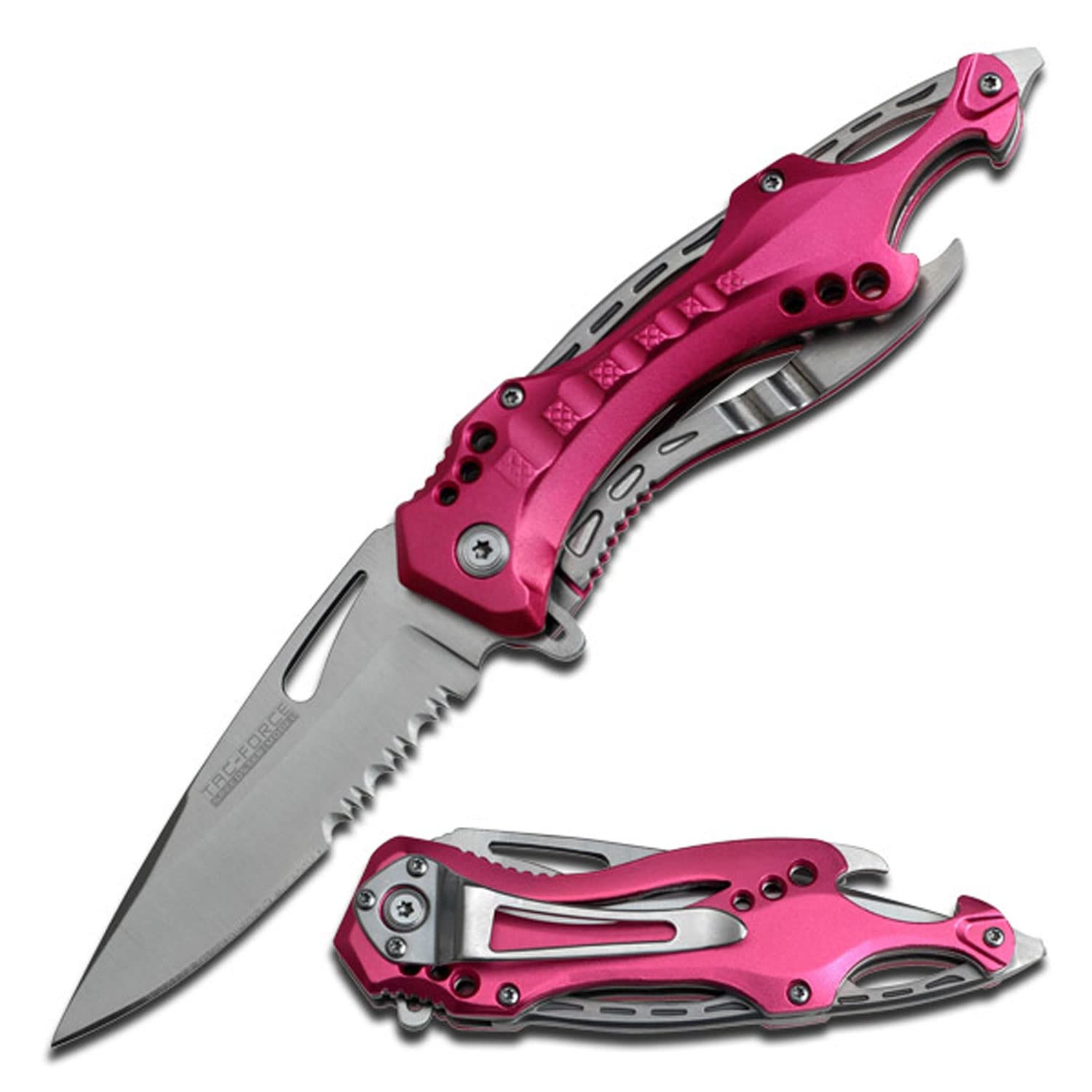 The TAC Force Assisted Opening Tactical Folding Knife (model TF-705PK) features a black half-serrated blade and a pink handle, with a 4-1/2-inch closed length. Offering easy one-handed deployment, this spring assisted open folding knife locks securely into place with the use of its liner lock. This knife features a 3-1/4-inch, 3mm thick stainless steel blade. The aluminum handle features a bottle opener and a glass breaker on the end, which can punch out the window of a car in an emergency. It also has a pocket clip for easy and safe carry. TAC Force designs spring assist folding knives that offer the rapid deployment desired by EMTs, Fire/Rescue, and first responders. They're available in a wide range of styles -- from hunting to tactical and collectibles to fantasy.