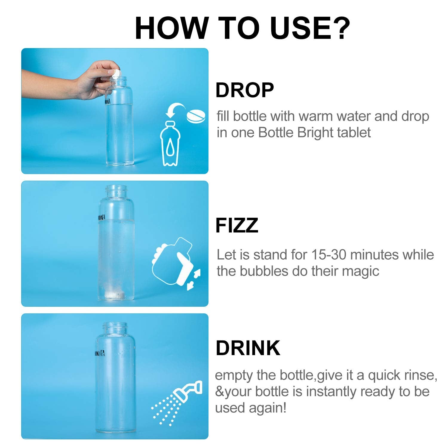 - EASY TO USE: Simple to clean your sport water bottles, no need other cleaning tools - fill the water containers with warm water, then drop in a cleaning tablet, let it stand for 15~30 minutes, finally empty the water containers and rinse the container thoroughly, your bottle is instantly ready to be used again. Cleans quickly & effectively, refreshes the inside.