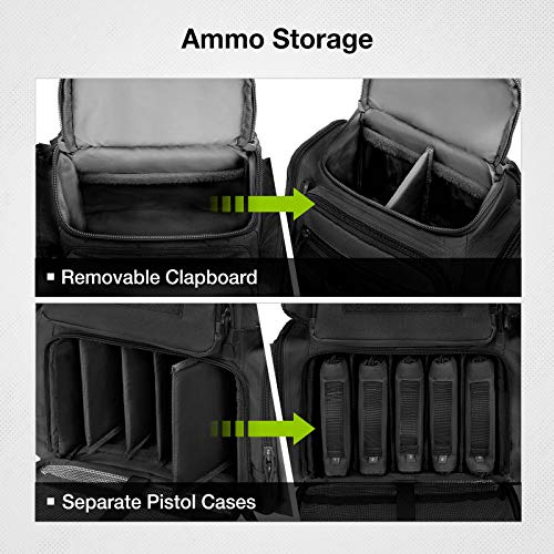 - 【Unique Ammo Storage】Adjustable clapboard is equipped in the top pocket, fits your different size of headphone and ammunition. TideWe uses dividers in the bottom pocket, offers perfect space for your handguns. 5 removable pistol cases are offered for secure transporting your pistols to the range. 6 extra magazines are also included in twin side pockets.