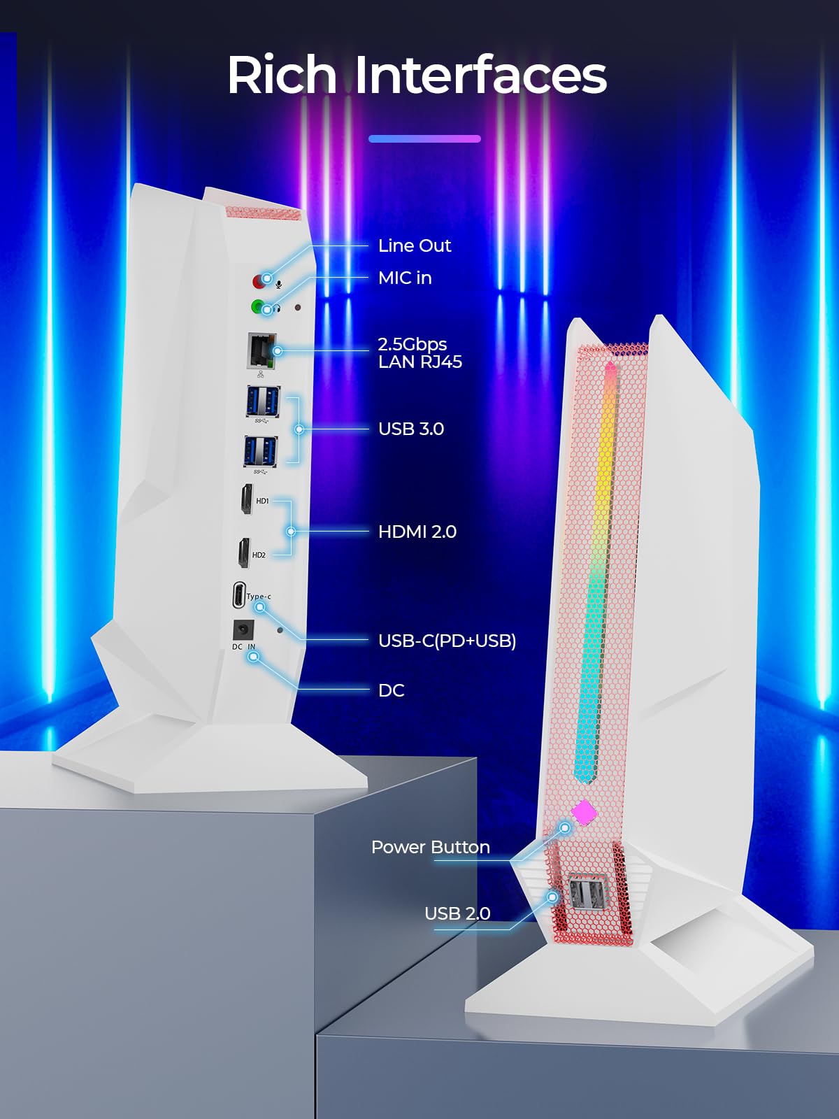 - π[4K UHD & 2 Screens Support] The T1 Mini Gaming PC features 2 x HDMI 2.0 (4K 60Hz) output ports, allowing users to connect up to three monitors simultaneously to multitask, play games and enjoy clearer, more lifelike visuals.