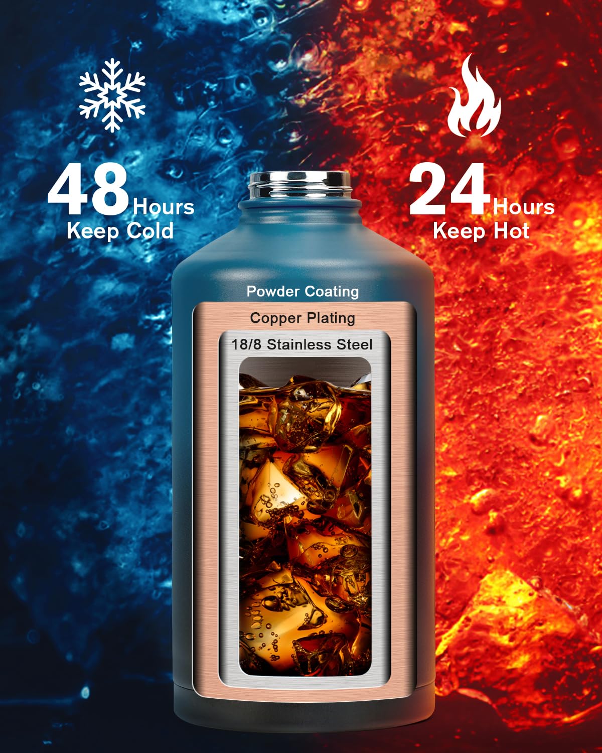 - Cold for 48H & Hot for 24H:Topre 128 oz One Gallon Insulated Water Bottle features advanced double-wall vacuum insulation with copper plating, the water flask preserve the freshness and temperature of your drinks throughout the day.