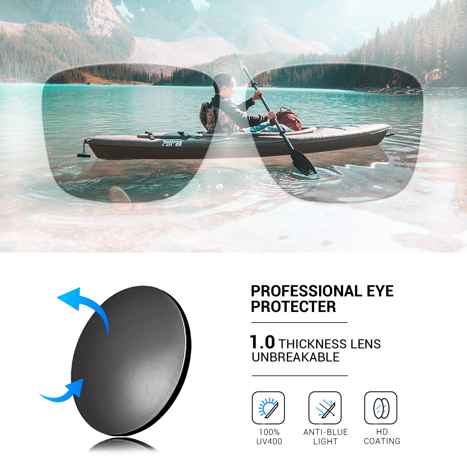 - TOREGE TAC POLARIZED LENS-100% UV 400 protection coating, blocks 100% harmful UVA, UVB&UVC and blue light. Restore true color, eliminate glare and reflected light, make the scenery more clear and real. Since the light with wavelength below 400 nanometer are the ultra violet light range which is harmful for the eyes, this sunglasses will give the complete UV protection for people to protect their eyes perfectly.