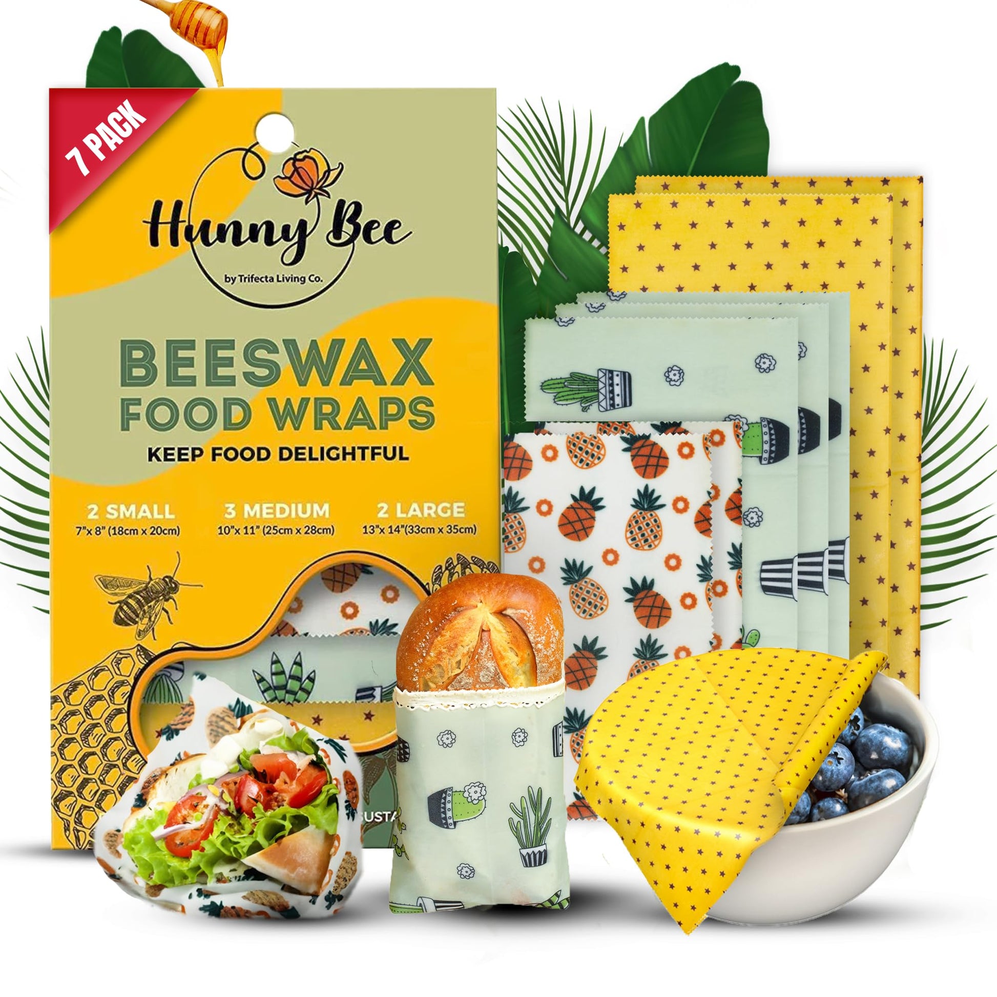 Trifecta Living Co. Versatile Beeswax Wraps,Set of 7-Fresh Food Keeper, Durable & Easily Cleaned, Sustainable Step Towards a Zero-Waste Kitchen, Unique Designs (Pineapple, Cactus, Star)