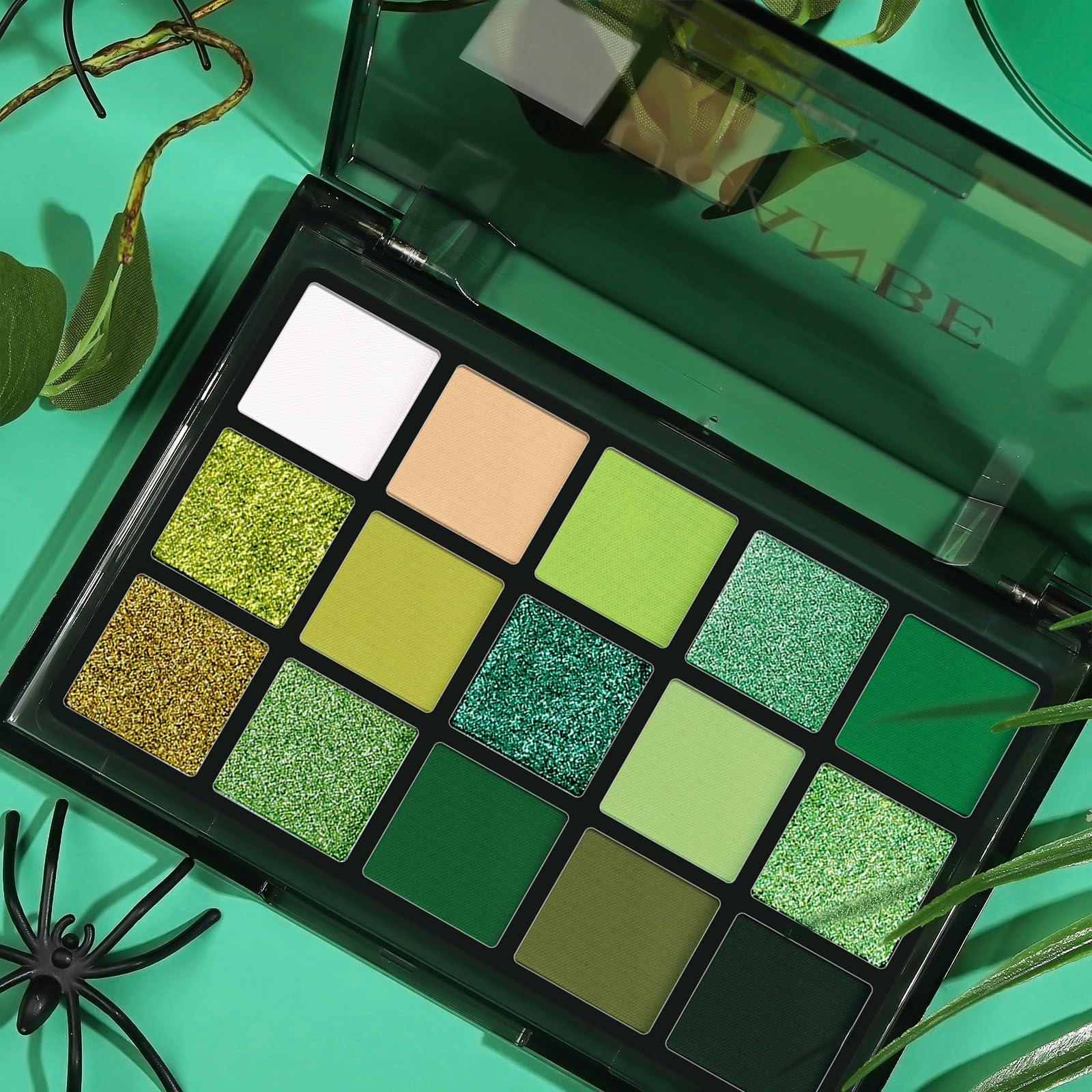 UCANBE Green Eyeshadow Makeup Palette, 15 Colors Bright Dark Green Shimmer Matte Metallic Glitter Eye Shadow, Forest Emerald Lime Pallet Kit for Cosplay Parties Christmas Halloween SFX