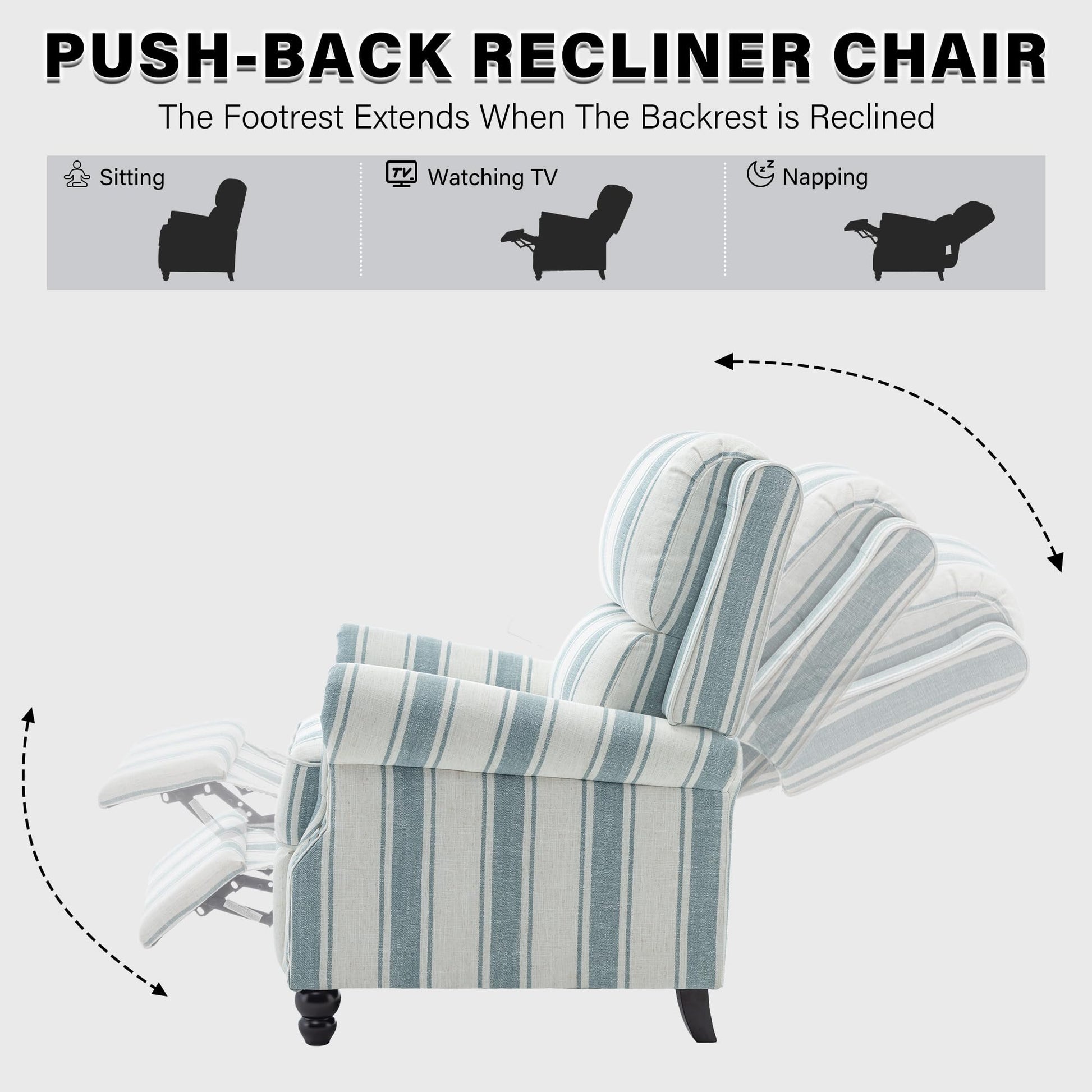 - Adjustable Backrest to Any Position - Push Back Recliner Adjust to Any Angle for You Need(105°-136°), providing you with 3 relaxation modes: you can sit, recline and lie flat. Cooperating with the footrest to meet your different needs, like reading a book, watching TV, going to bed, or getting up for leaving. Now, find your preferred reclining position! Place your hands on the arms of the reclining chair while pushing the arms forward and leaning the chair back with your weight!