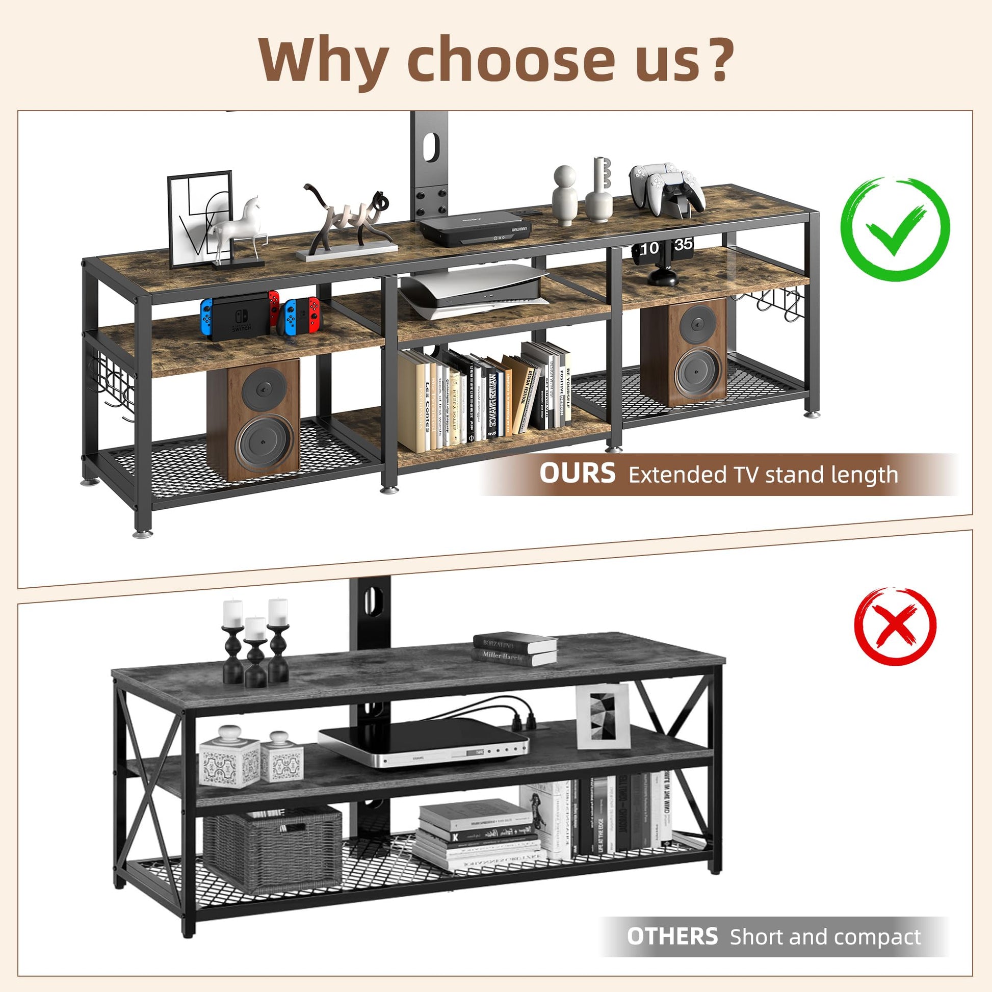 - 【Charming Rustic Style with Modern Elegance】Featuring a rustic brown finish paired with matte black steel bars, this TV stand combines industrial, vintage, and farmhouse aesthetics. Its stylish yet practical design complements various home decors, from modern to traditional, adding a touch of elegance and warmth to any living space.