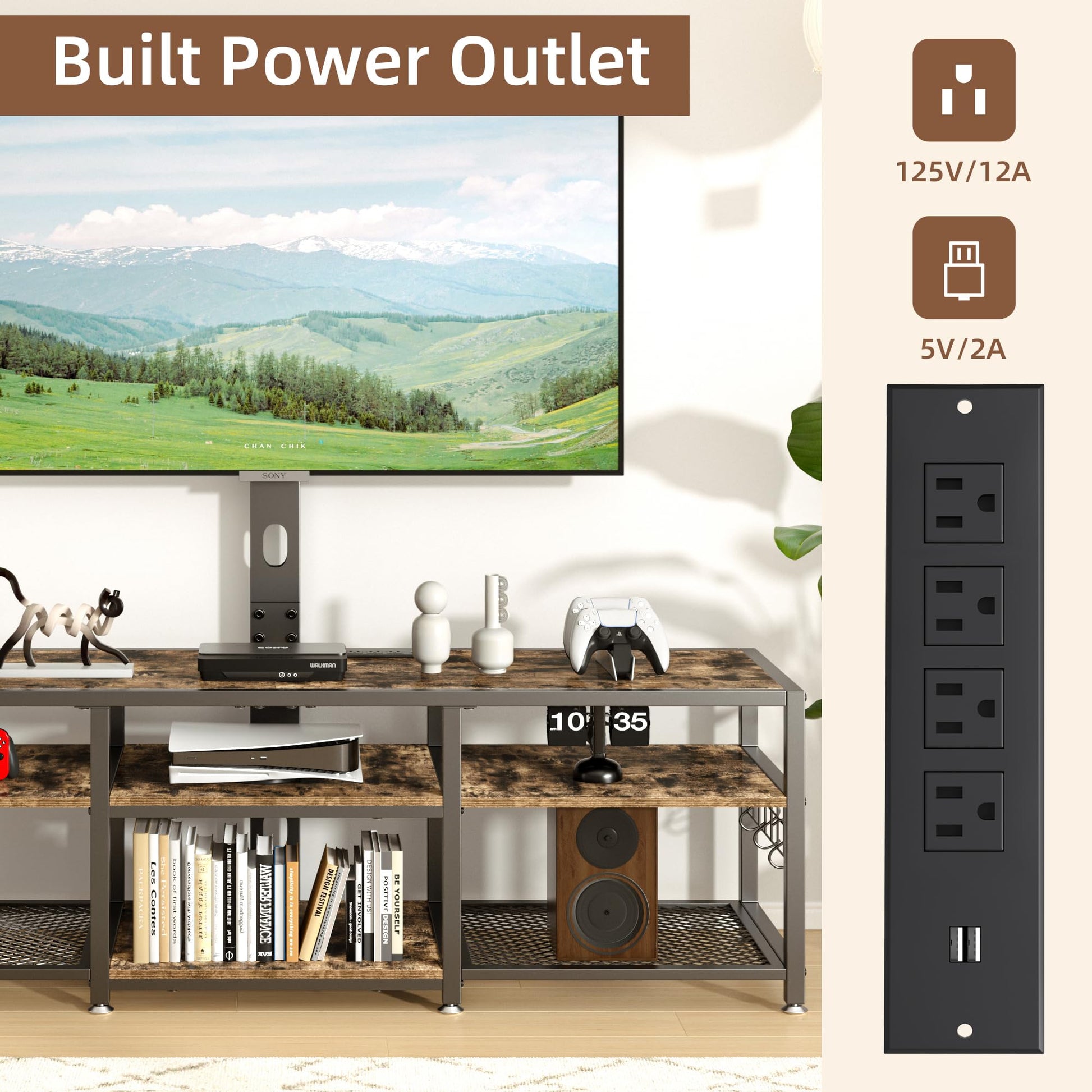 - 【Convenient Power Outlet and USB Ports】Equipped with a built-in power strip and four outlets, this TV stand allows you to easily power your TV, gaming devices, and other electronics. The integrated USB ports help you charge your devices without needing extra cables or adapters, reducing clutter and offering a tidy, organized setup.