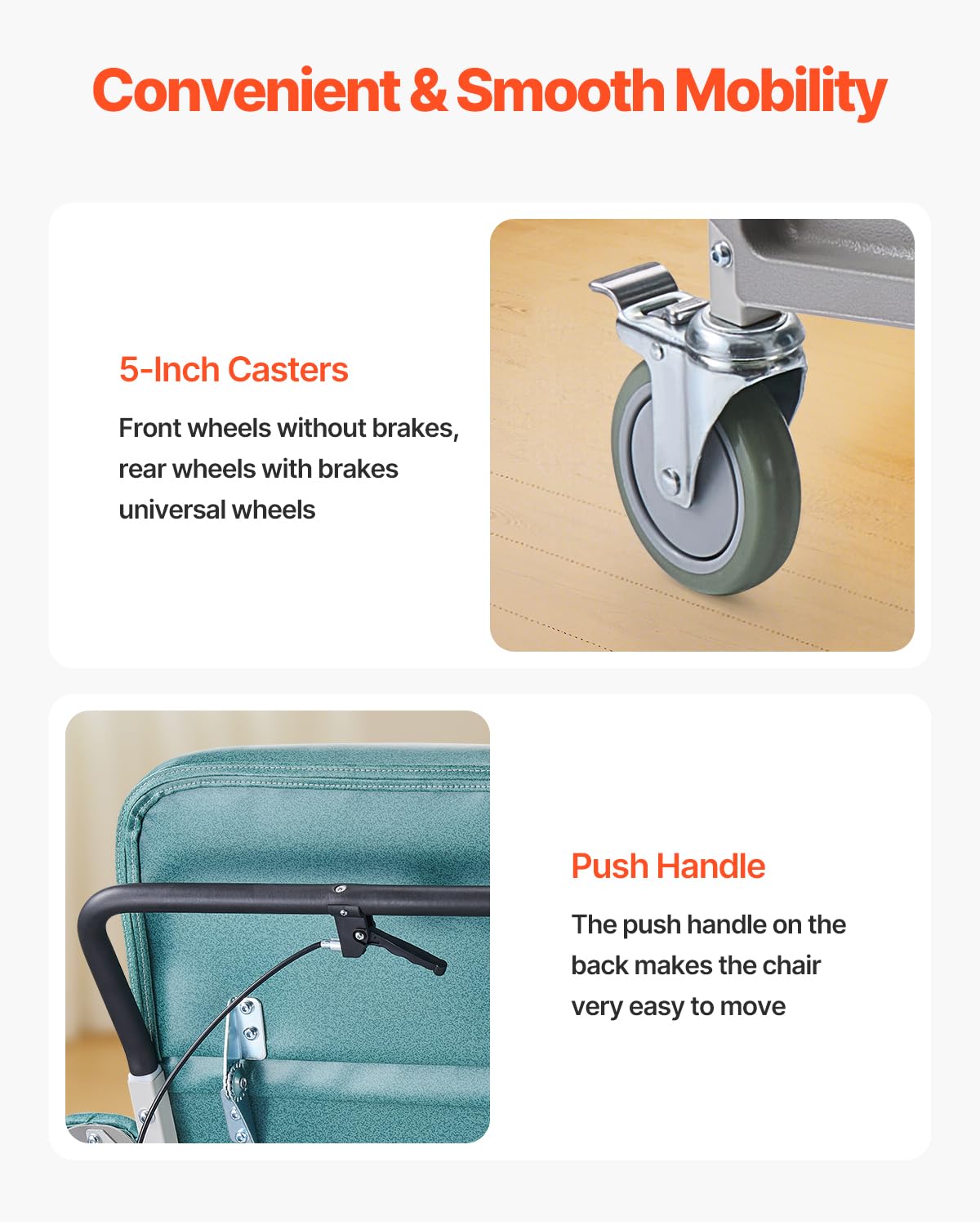 - Effortless Mobility: Our medical geri recliner features four 5-inch smooth-rolling casters, including 4 universal wheels (2 lockable rear wheels with brakes), along with a convenient push handle, ensuring smooth movement and secure positioning across various spaces