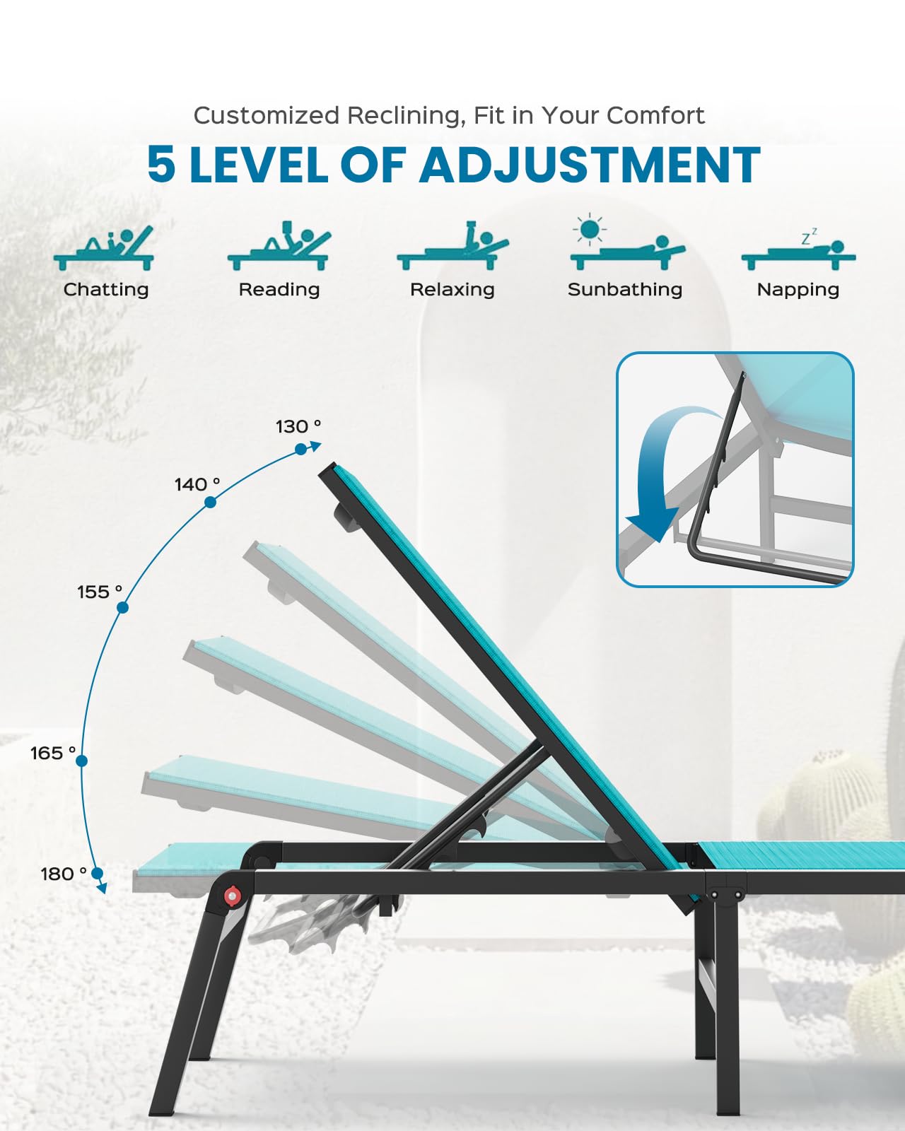 - 5-Position Adjustable Backrest - Experience ultimate comfort with our patio lounge chair’s five recline options. Whether you’re reading, napping, or simply relaxing, adjust the backrest from upright to fully reclined to find your perfect angle
