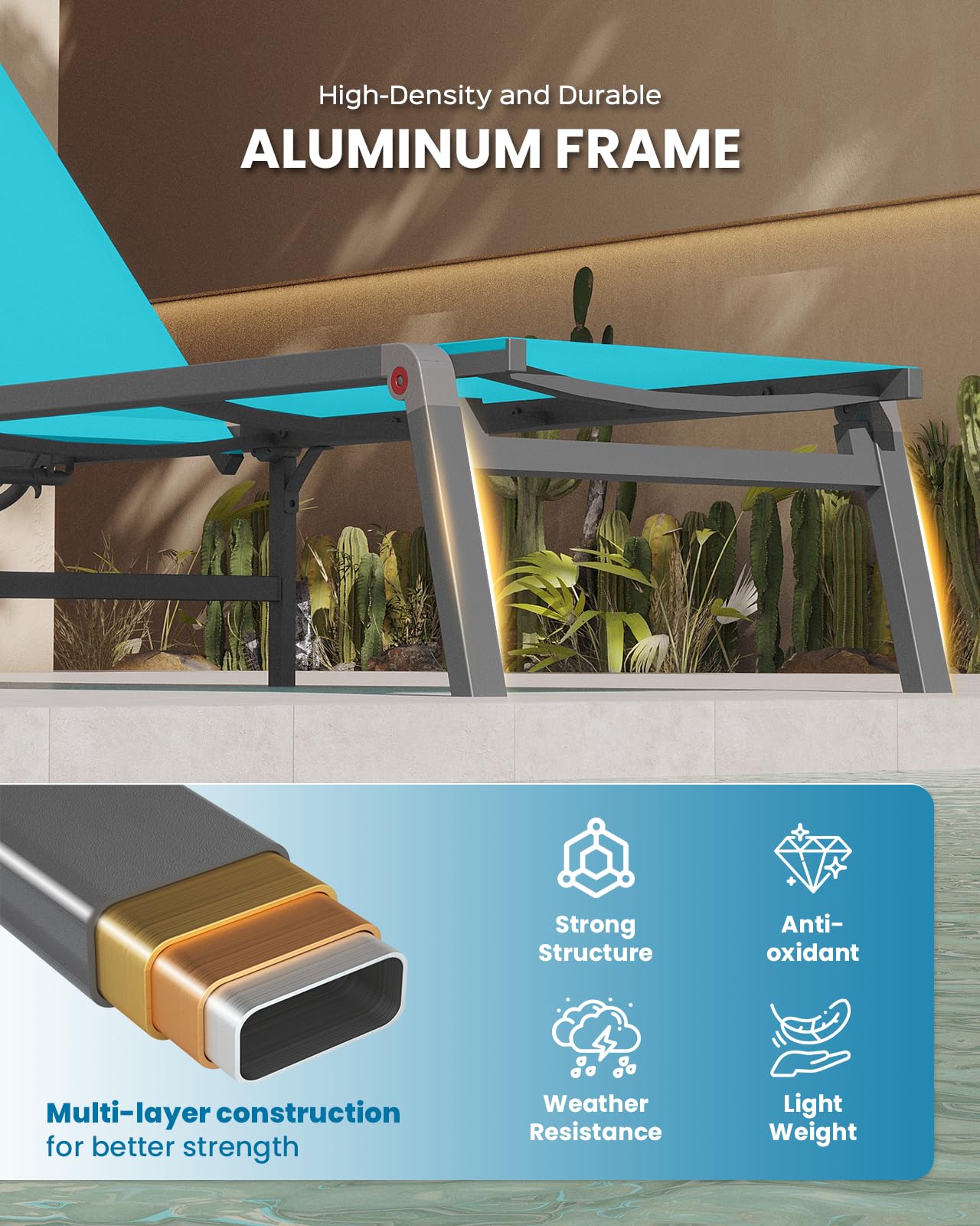 - Rust-Resistant Aluminum Frame - Built with a durable aluminum frame covered in an anti-rust powder coating, this pool lounge chair withstands outdoor elements. Its robust design provides longevity and low maintenance for carefree outdoor relaxation