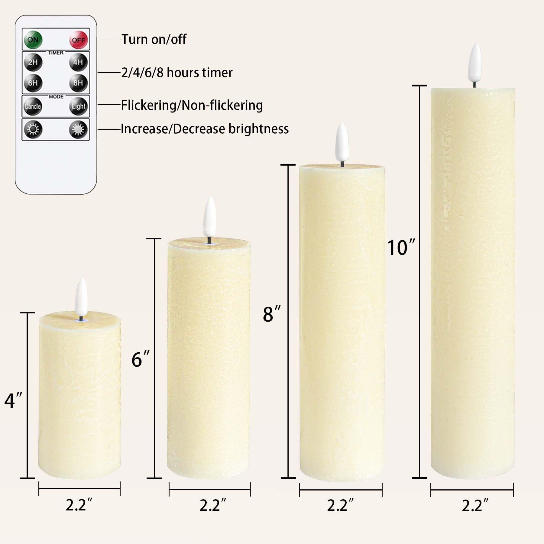 Vtobay Flickering Flameless Pillar Candles with Remote Control and Cycle Timer,Ivory Pack of 4 Battery Operated(Powered by 2AA) LED Real Wax Tall Fake 3D-Wick Electric Candles(D 2.2” x H 4”,6”,8”,10”)