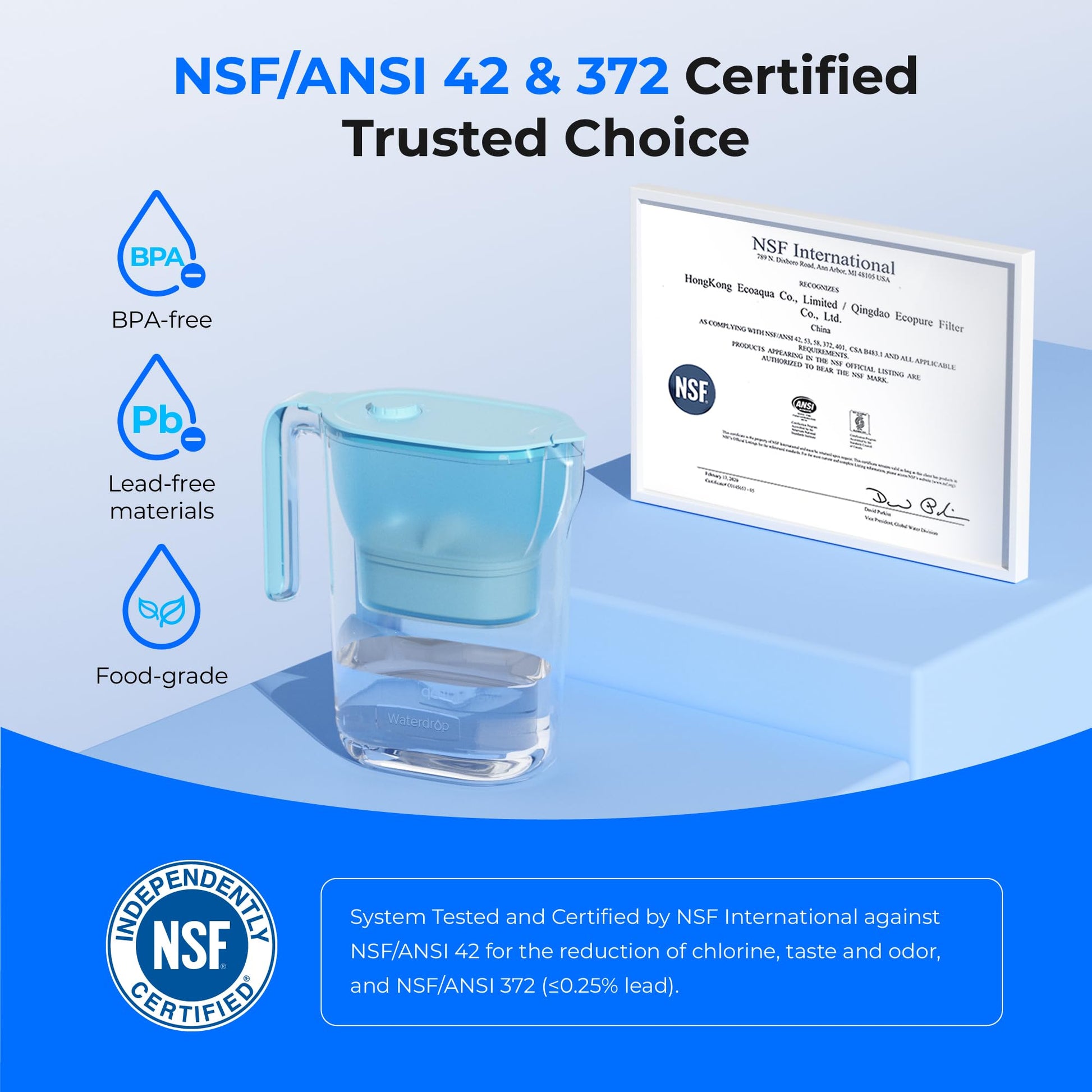 - [NSF/ANSI 372 & 42 Certified] This countertop water pitcher filter has been certified by NSF International against NSF/ANSI 372 & 42, confirming the use of high-quality activated carbon fiber only. It can reduce numerous substances like chlorine, taste and odor, PFOA, PFOS, iron, calcium, copper, mercury, magnesium and more in your tap water, tested by a third-party lab, providing you with great-tasting water. Note: This system DOES NOT lower TDS value.