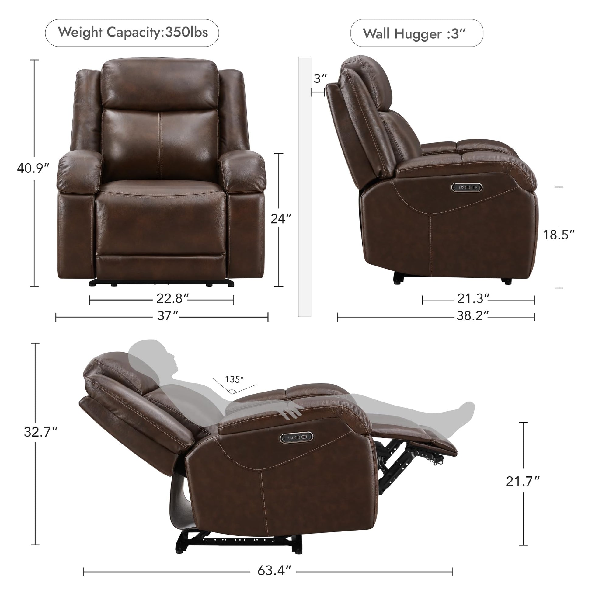 - Wall Hugger Recliner: Electric recliner chairs are perfect for small spaces, making them perfect if you don't have a lot of room but still want the ability to recline (e.g., in the RV). When you ease into the reclining position, the seat moves forward while maintaining no gap between the back and seat. Overall Dimensions: 38.2''D x 37''W x 40.9''H