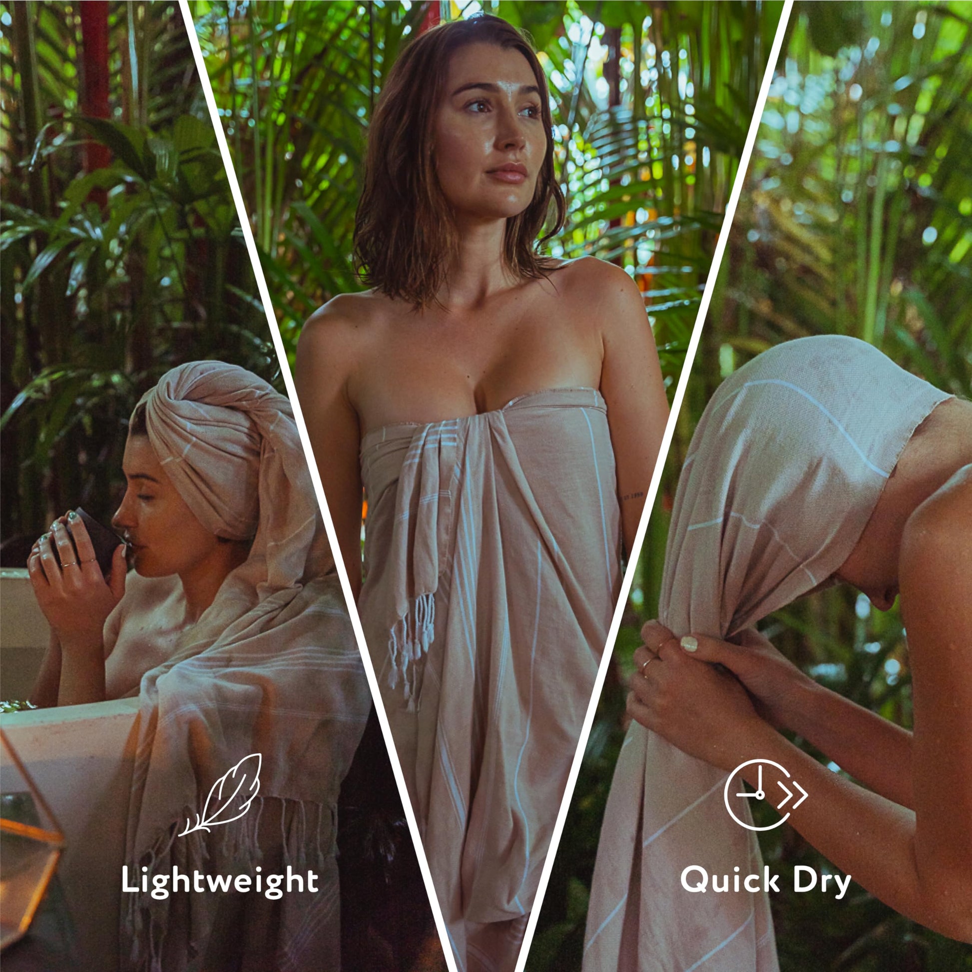 - GREAT ON-THE-GO: Thinner than terrycloth but just as absorbent, our Turkish Towel is a must-have after your shower. Super-convenient to pack and carry, it’s non-bulky for easy travel. Compact and lightweight, it folds down to maximize space in your luggage or closet.