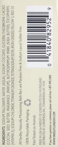 Details: Since 1770, Yardley bath soaps have stood as a symbol of English luxury. Today that tradition continues with bath soaps crafted with essential oils and moisturizing ingredients that nourish your skin from the outside in. Yardley's Cocoa Butter Nourishing Bath Bar is enriched with skin-conditioning ingredients like pure cocoa butter, shea butter, and vitamin E to help soften dry skin and lock in moisture. Yardley London Cocoa Butter Moisturizing Bath Soap Bar gently cleanses, leaving the skin feeling beautifully replenished and scented with luxurious notes of cocoa butter, vanilla, amber, and sandalwood. And all Yardley bath soaps are free from parabens, free from sodium lauryl sulfate, and never tested on animals. Rich in lather and in heritage, a collection of favorite scents are the perfect gift to yourself or someone you care about. Whether it's a luxurious weekend bath time, or a quick daily 15-minute escape, our aromatic scents and natural ingredients work in perfect unison to gently yet effectively cleanse and care for precious skin.